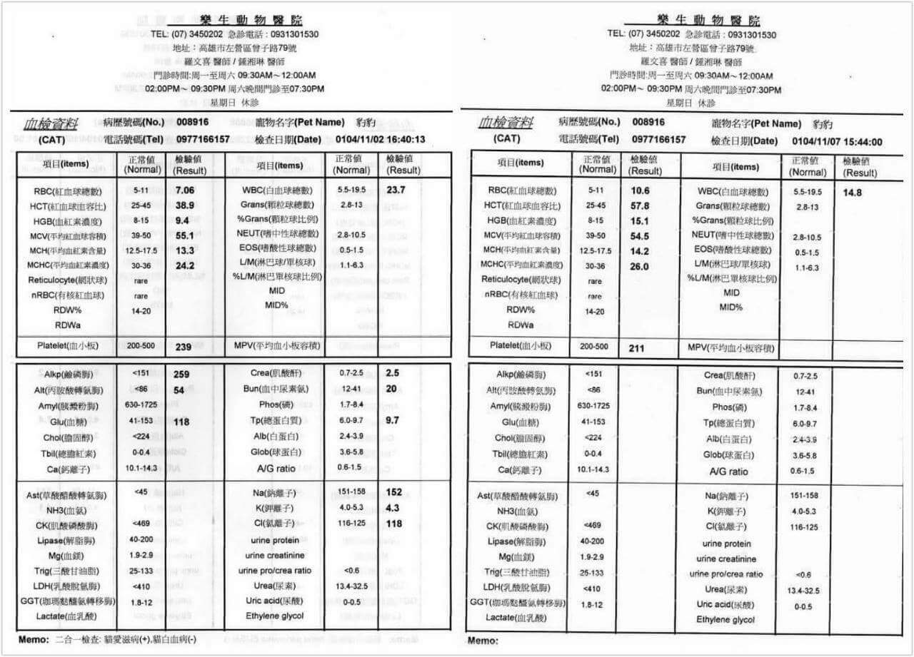 經醫師檢查結果,豹豹的右腳為蜂窩性組織炎有很大的一個傷口,骨頭並未斷裂或受傷,初步血檢白血球及alkp偏高,貓二合一檢驗,貓愛滋為陽性,醫療費用如下: