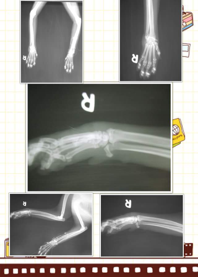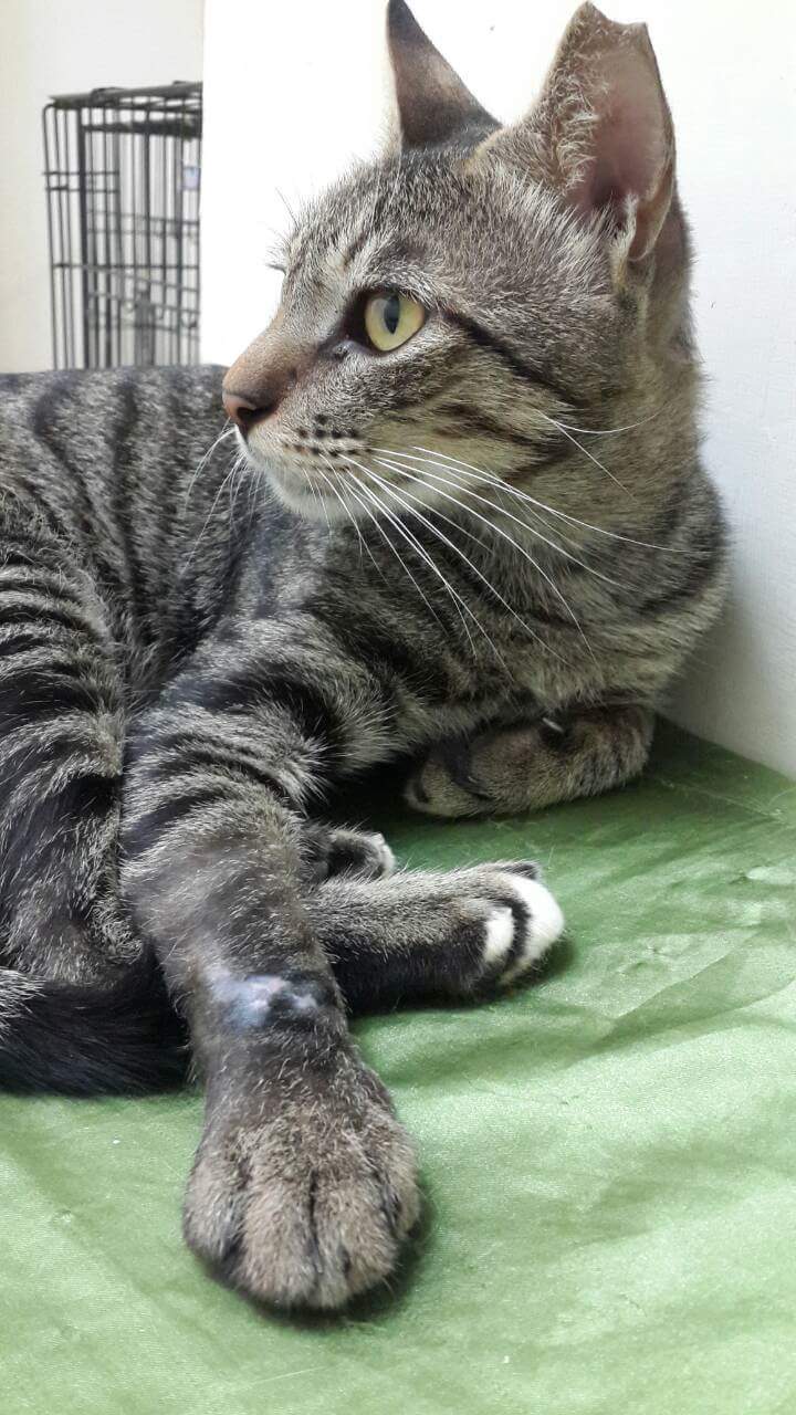 豹豹是我新家餵養區的孩子,每天聽到我來時,都會一邊喵,一邊跑來吃飯,有2天放飯時豹豹沒出現,2天後出現了,但發現他的右前肢受傷了跛腳,無法著地,都用3隻腳行動,擔心是否為車禍骨折,於是補抓帶至醫院檢查。