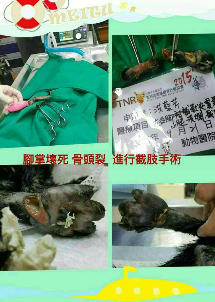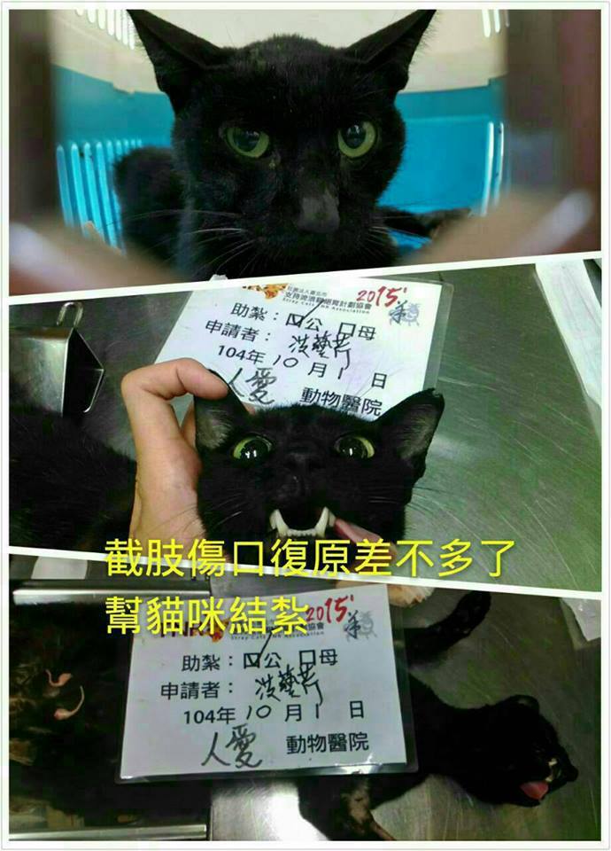 主題: 大坪頂捕獸夾貓咪 申請者姓名: 洪藝芹 花色: 申請日期: 2015-11-10 23:41:12 申請者部落格: 申請者臉書網址: 所在縣市/合作醫院: 高雄市/人愛動物醫院 治療費用: 21590元 需求人數: 23人 已結案 (2023-01-18 23:39:25) 報名人員: Chia-Chieh Chiang x3(已付款)、眼睛 x3(已付款)、Hedy Liu(已付款)、王小盈、李凱特(已付款)、丰(已付款)、王琇盈(已付款)、洪至韋、fishmoney(已付款)、Po-Lin Chen(已付款)、徐雅嬪(已付款)、薇薇安(已付款)、Claire Wu(已付款)、陳志豪(已付款)、橘子貓(已付款)、斑比(已付款)、Daisy(已付款)、cafeyi(已付款)、chlh(已付款)、tau511(已付款)、Gato(已付款)、 候補人員: 動物病情說明: 你好我是一個接貓餵者,當我在餵食街貓時,發現了這隻瘦到不行的黑貓,在那緩慢的移動身軀走近一看才發現他的腳嚴重受傷,不忍心所以把它帶回家中隔天送往醫院治療,平常省吃儉用餵食流浪貓流浪狗,實在無法再負擔如此龐大的費用,懇請協會給予協助,感恩!