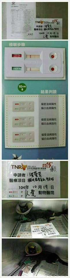 隔天先帶去鄰近的獸醫院就診,醫生說看牠的狀況感覺不太理想,隔天立即送回人愛動物醫院,經醫生檢查發現,貓咪眼睛精神沈鬱,約8-10%脫水,粘膜蒼白,聽診心雜音很重且沈,恐有生命危險,建議需抽血檢查病住院點滴治療,驗血結果,敗血症,貧血,嚴重腎衰竭,懷疑誤食登革熱化學藥物中毒,愛滋病呈陽性反應,經過醫生治療,黑貓的狀況並不樂觀,在10/21貓咪陷入休克昏迷,醫生緊急施予純氧及強心劑急救,仍宣告不治。