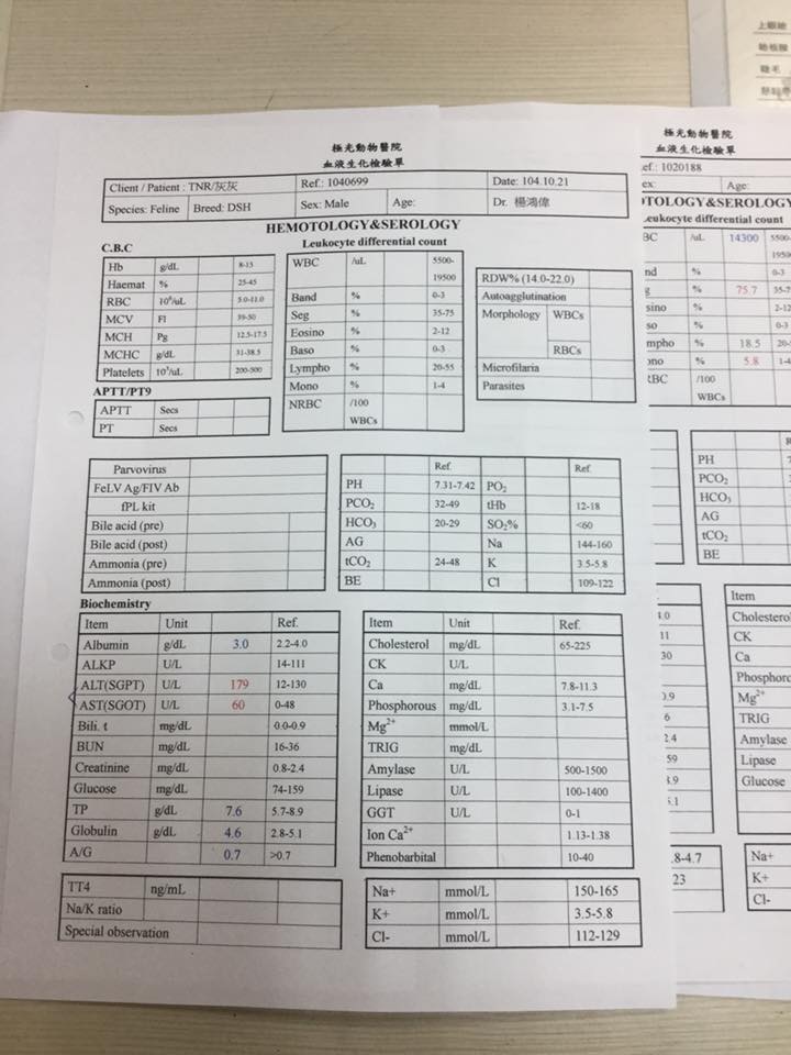 送醫檢查後發現白血球比較高,中性球以及單核球增加,A/G比下降,