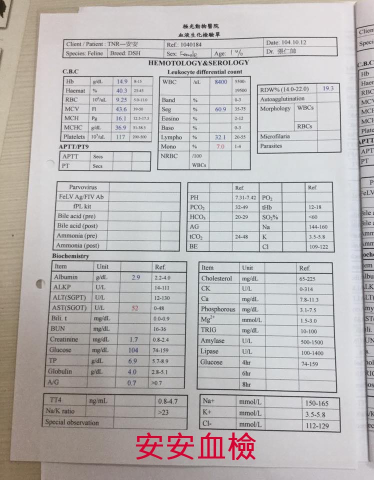 10/12就診後發現安小虎除了淋巴結腫大之外、體溫及血檢還算正常