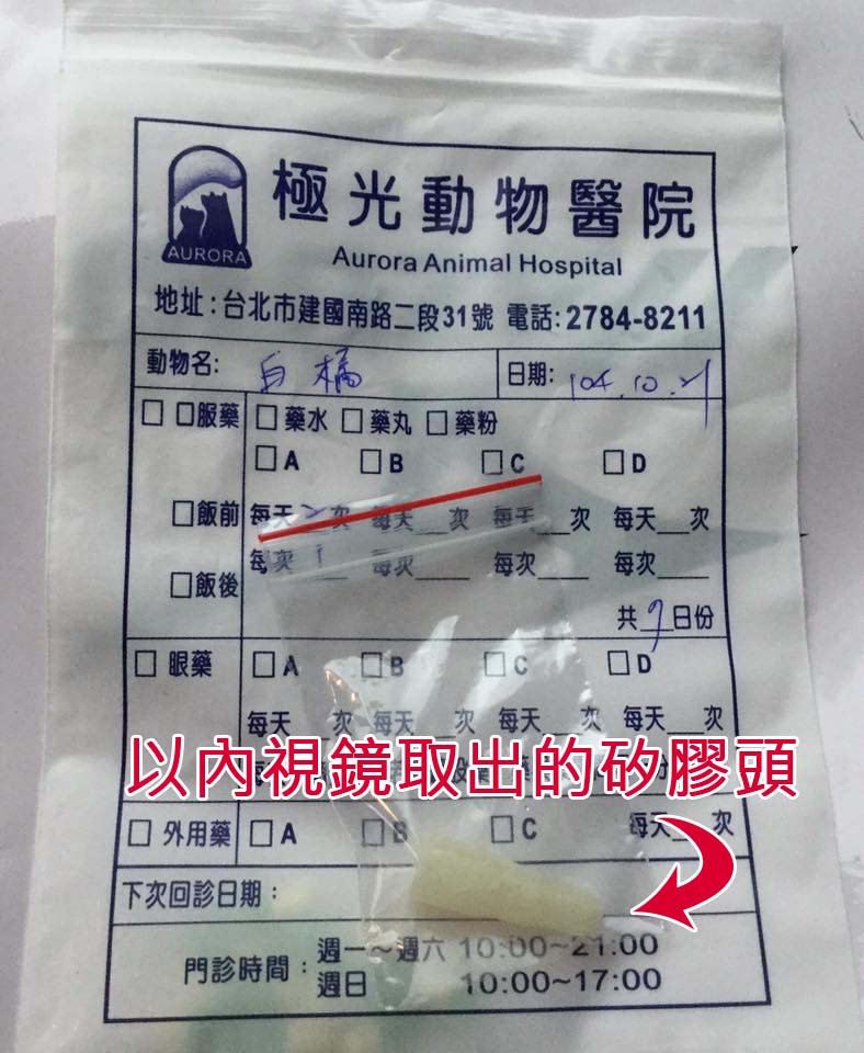 但10/18時,緊張的白橘誤吞入餵藥器的矽膠頭,