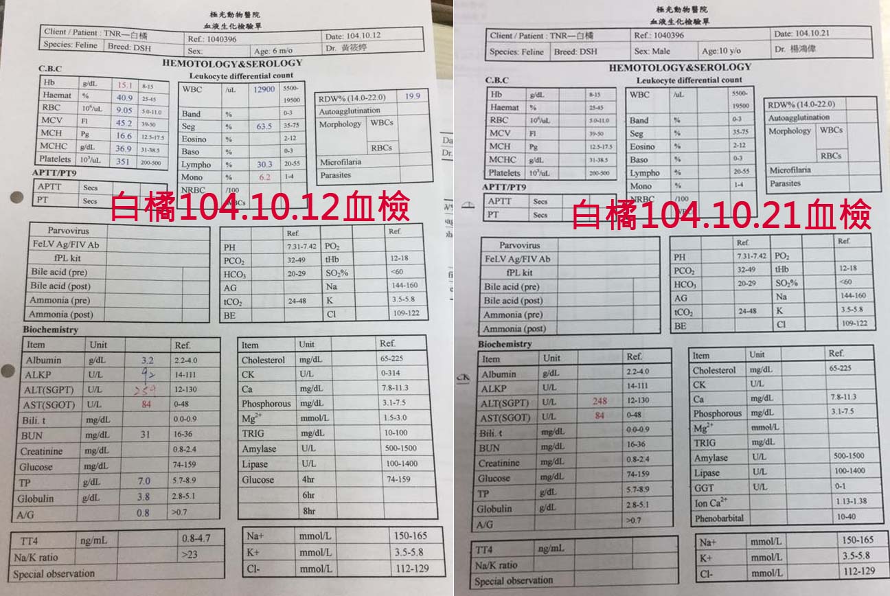 與白橘狀況差不多都同樣出現單核球增加,肝指數2項均明顯升高,一樣研判有肝炎現象..