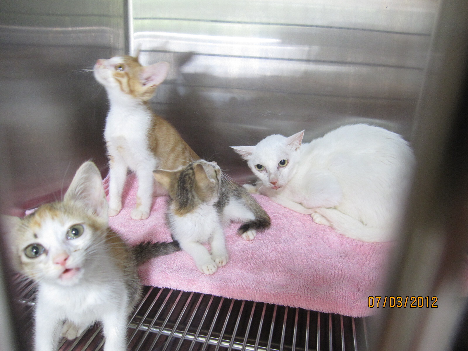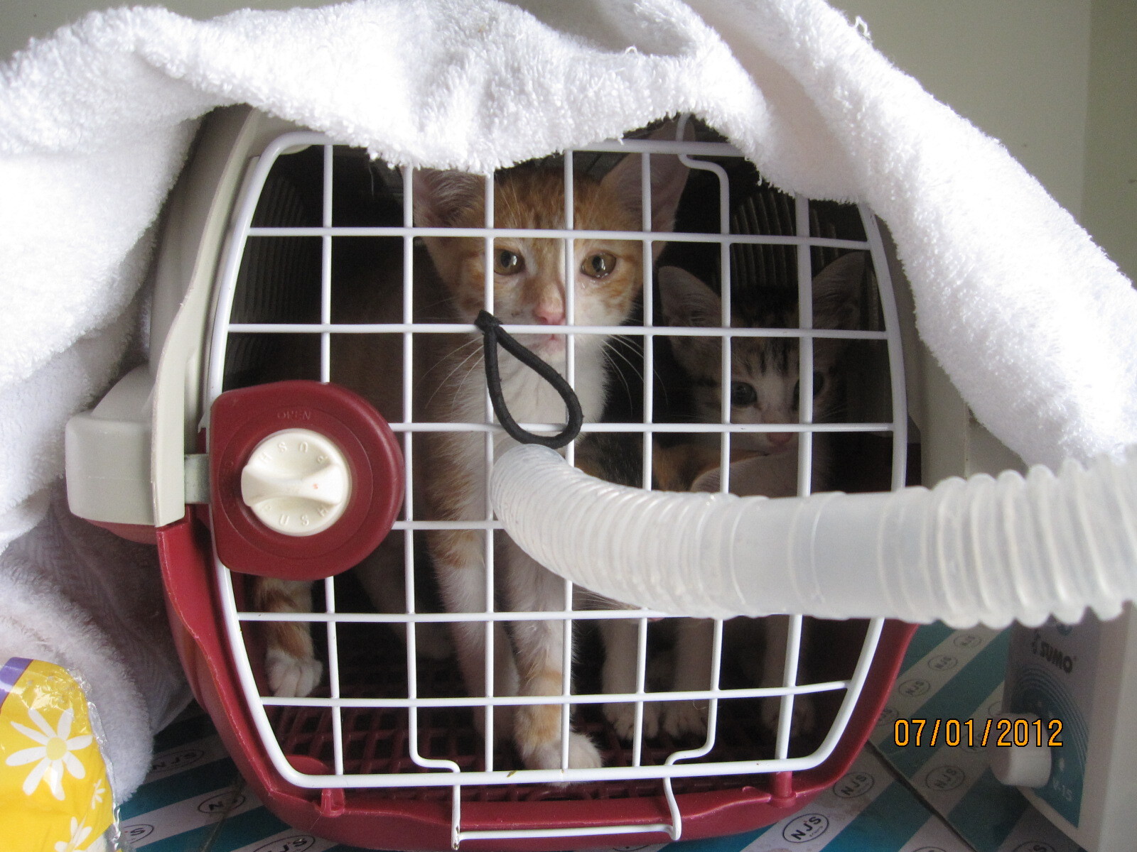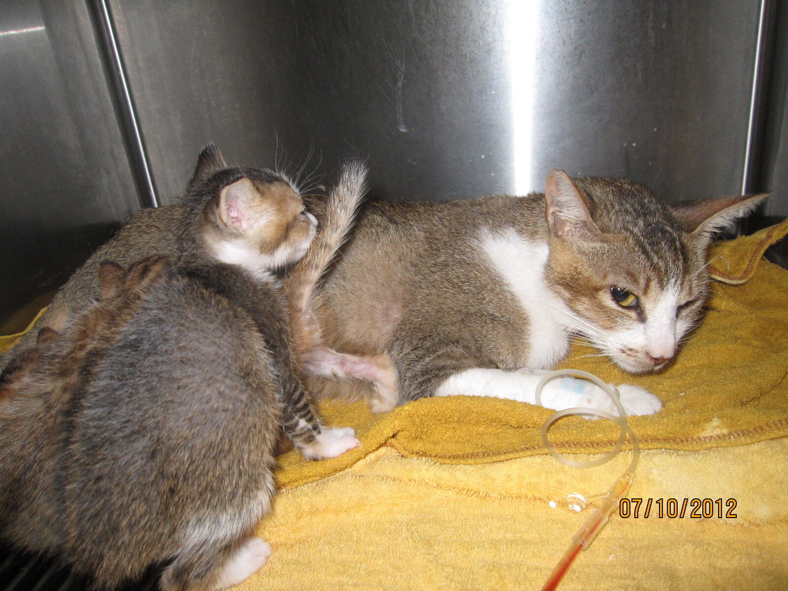 伴隨著母貓也染上感冒,一家子都接受住院治療,直到母貓可以自行排尿,進食,現在我已接回一家照顧,餵藥,噴霧治療等..