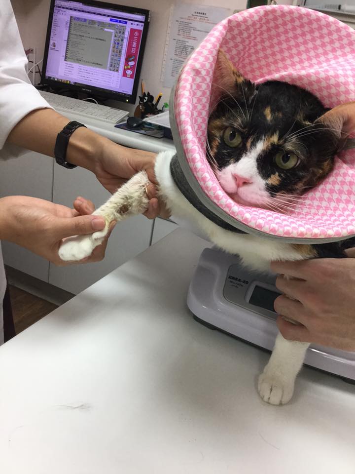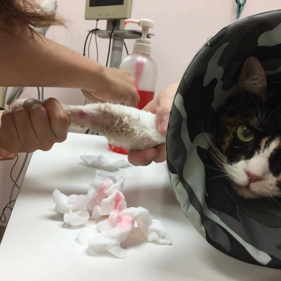 可能因為萬年頭套脫落,讓花嬸有機會舔到傷口所致,