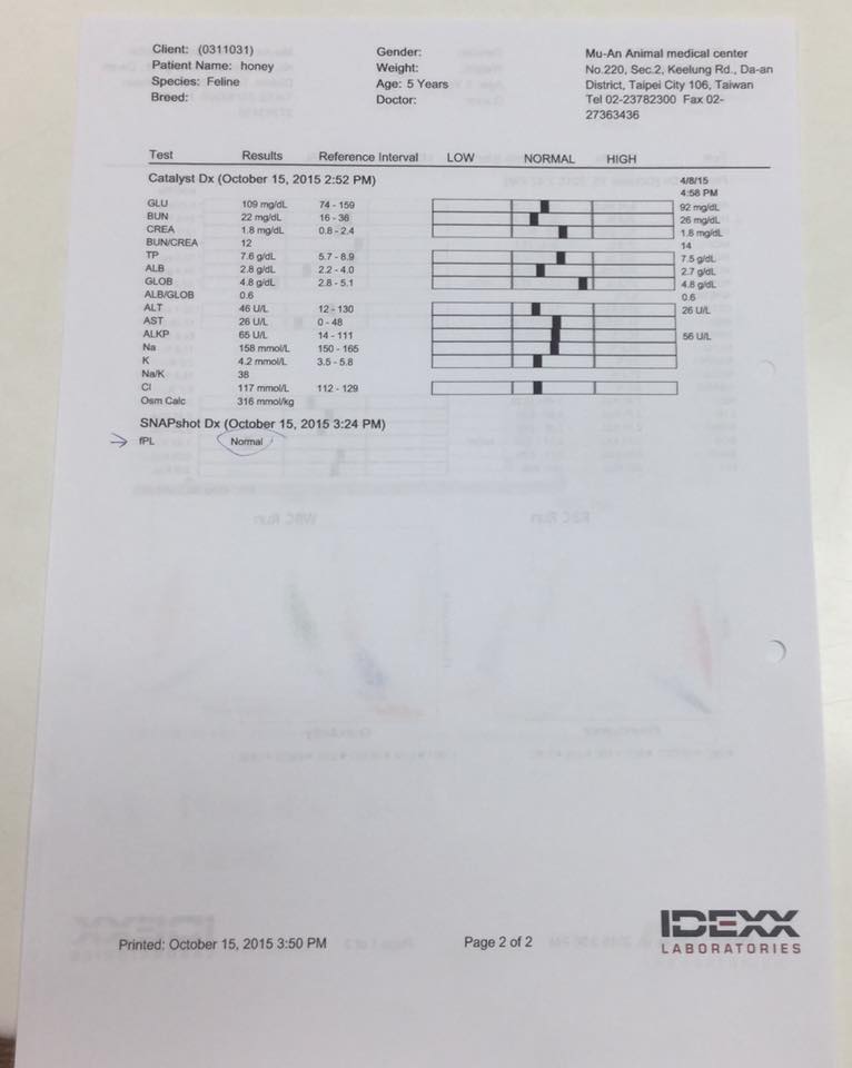 主題: 消化系統感染,導致胃腸肝皆受損的,聽不見的無聲哈妮 申請者姓名: 臺北市支持流浪貓絕育計劃協會 花色: 申請日期: 2015-11-19 15:55:10 申請者部落格: 申請者臉書網址: 所在縣市/合作醫院: 台北市/其他院所醫助專案(醫院請先MAIL溝通) 治療費用: 9000元 需求人數: 11人 已結案 (2023-01-18 23:38:25) 報名人員: Sophia Huang、Sophia Huang(已付款)、Sara Stone(已付款)、madbucky(已付款)、Ting(已付款)、Vicky Chang Shyr(已付款)、stupid(已付款)、黃羿霏/徐粉粉(已付款)、hanacom(已付款)、潘潘 x3(已付款)、 候補人員: 動物病情說明: 溫順乖巧的Honey,是一隻與其他品種貓一起被丟棄的波斯貓,