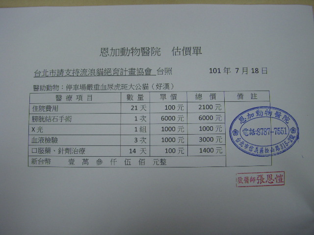 主題: 停車場嚴重血尿虎斑大公貓(好漢) 申請者姓名: 高進隨 花色: 申請日期: 2012-07-21 11:29:52 申請者部落格: 申請者臉書網址: 所在縣市/合作醫院: 台北市/恩加動物醫院 治療費用: 13500元 需求人數: 30人 已結案 (2013-06-27 13:20:09) 報名人員: 小強(已付款)、維琪、王興賢(已付款)、周小蕾(已付款)、王惠珍(已付款)、Tristain Chao(已付款)、靖靖(已付款)、WeiLin Chen(已付款)、冥王星獅子(已付款)、Yun-Ping Lin(已付款)、Ginny Lin(已付款)、Peggy Tsai(已付款)、Debby Hsieh(已付款)、Katilin Chang(已付款)、Jerry(已付款)、縱逸子(已付款)、Ailin Wang(已付款)、婁婁、Jeff(已付款)、維琪(已付款)、CANDY(已付款)、蝸牛(已付款)、Ju-jan Hsu(已付款)、Pinky(已付款)、Sam(已付款)、py(已付款)、Petty Taso、Petty Taso、吳溱溱(已付款)、b_b3003(已付款)、憲忠、小舟(已付款)、小舟(已付款)、小舟(已付款)、春卷(已付款)、 候補人員: 動物病情說明: 這隻虎斑大公貓(名字:好漢)住在台北市家樂福地下停車場中,原本是想要將他進行TNR後,讓他繼續原本快樂的生活!