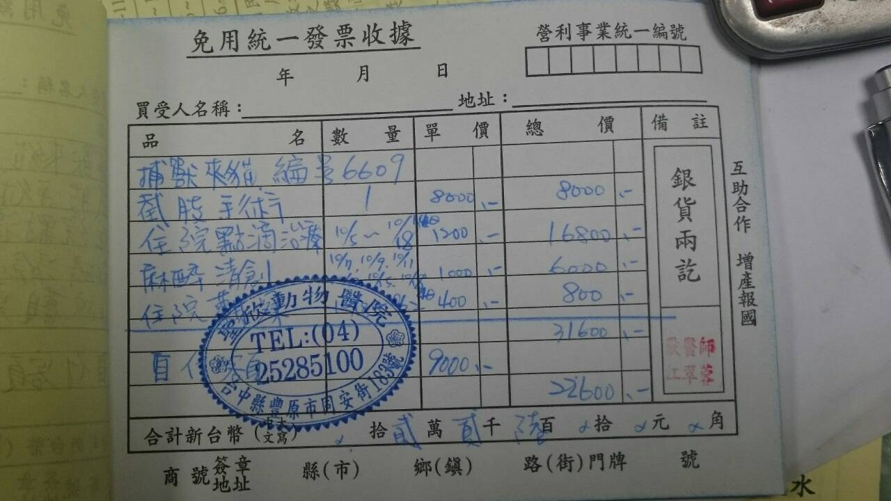 主題: 貓咪被捕獸夾夾斷腳 申請者姓名: 王柏涵 花色: 申請日期: 2015-12-01 22:16:38 申請者部落格: 申請者臉書網址: https://www.facebook.com/wang.chopper 所在縣市/合作醫院: 台中市/聖欣動物醫院 治療費用: 22600元 需求人數: 25人 已結案 (2023-01-18 23:38:12) 報名人員: Amber Chung(已付款)、陳珍妮(已付款)、Patrick x20(已付款)、nami x3(已付款)、 候補人員: 動物病情說明: 10/04 發現貓咪,這隻貓咪也是我做TNR的客人之一,好幾天沒有出現吃飯,10/04發現貓咪腳上已經中了捕獸夾一直拖行