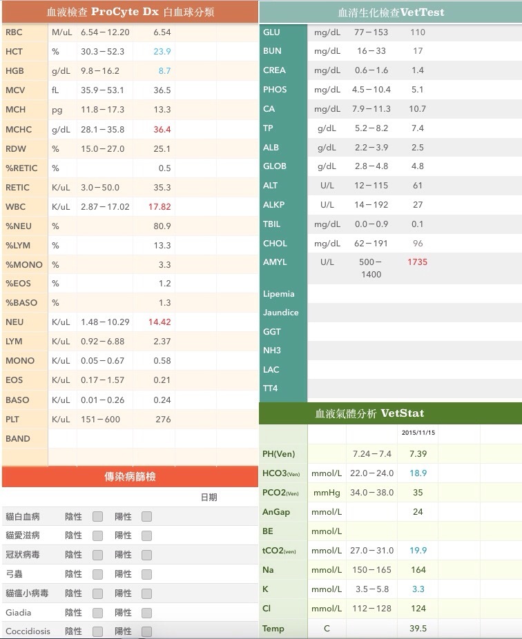 主題: 浪貓撕裂傷醫助申請 申請者姓名: 彭浩羽 花色: 申請日期: 2015-12-21 13:24:14 申請者部落格: 申請者臉書網址: 所在縣市/合作醫院: 高雄市/弘恩動物醫院 治療費用: 6500元 需求人數: 16人 已結案 (2023-01-18 23:38:02) 報名人員: Kitty Chen(已付款)、施孟(已付款)、ming(已付款)、邱小燁(已付款)、嘟嘟白白(已付款)、Vivian(已付款)、Noel6731(已付款)、魏咖(已付款)、Ting Wu x2(已付款)、Julia Linn(已付款)、捧公(已付款)、Elle(已付款)、Jane Huang(已付款)、馬利、馬利、Chi(已付款)、Annie Lee(已付款)、 候補人員: 動物病情說明: 11/15抓了7隻浪貓去結紮,結果醫生麻醉後,發現貓咪腋下有傷口,在現場無法提供醫療,請我們要送醫院治療,不然貓咪會有生命危險,因為是週日屏東找不到醫院有開的,也因為他是浪貓醫院不願意接,剛好得知貴協會有醫助可以幫助貓咪醫療,就就近送到高雄有開的醫院去做診治。