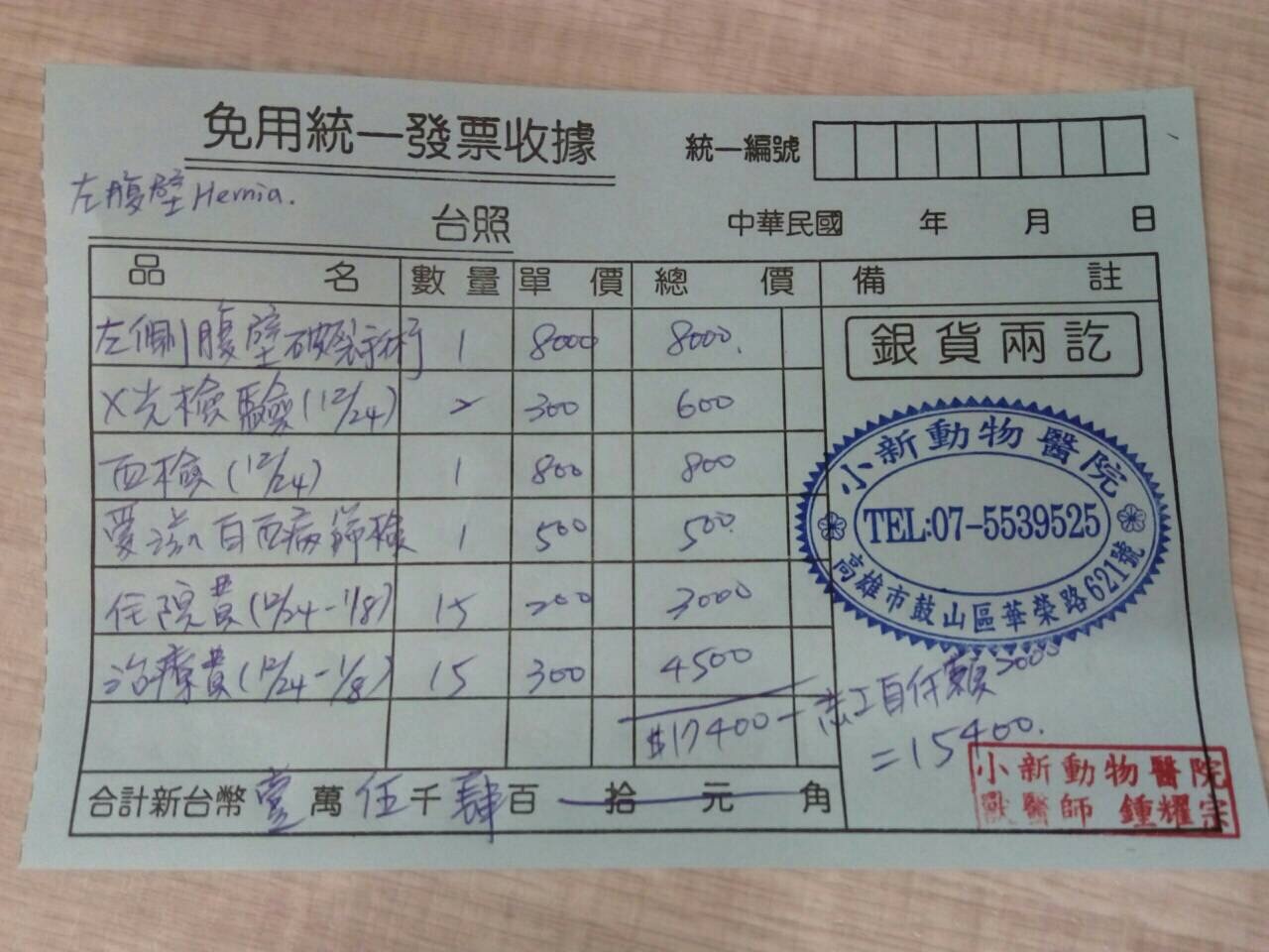 主題: 疝氣有如腫瘤的賓士 申請者姓名: 王伶如 花色: 申請日期: 2016-01-08 22:24:42 申請者部落格: 申請者臉書網址: https://www.facebook.com/xiao.tu.9465/media_set?set=a.1212174725476930.100000532424314&type=3 所在縣市/合作醫院: 高雄市/小新動物醫院 治療費用: 15400元 需求人數: 17人 已結案 (2024-06-01 13:42:59) 報名人員: 蘇瑪姬 x3(已付款)、王小盈、王拍拍(已付款)、Pin-Chen Lu(已付款)、吳花花(已付款)、Maggie(已付款)、林琦(已付款)、Li-Chuang Chiu(已付款)、chihting(已付款)、Jill1123(已付款)、Melody(已付款)、宋輸贏(已付款)、Peggy Tsai(已付款)、劉榕峻(已付款)、tau511(已付款)、Gabriella Liu(已付款)、 候補人員: 動物病情說明: !因可憐的小賓士最近才出現在家裡附近,看著他瘦小的雙腳,身體卻揹著ㄧ個大大的瘤,到處覓食!