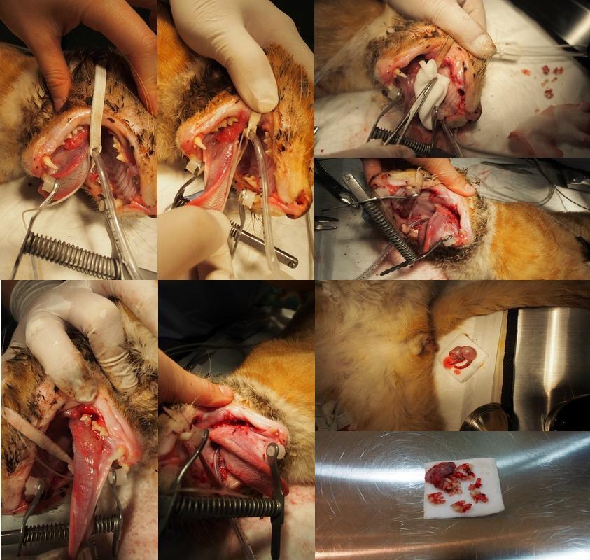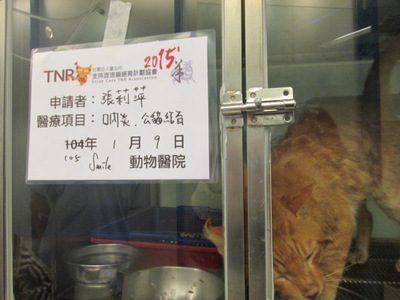 1/7 橘橘手術順利結束,犬齒保留外其餘均拔除,口內增生的息肉割除縫合,結紮,護理人員並將橘橘因口水弄髒的臉頰剃毛,看起來清爽多了
