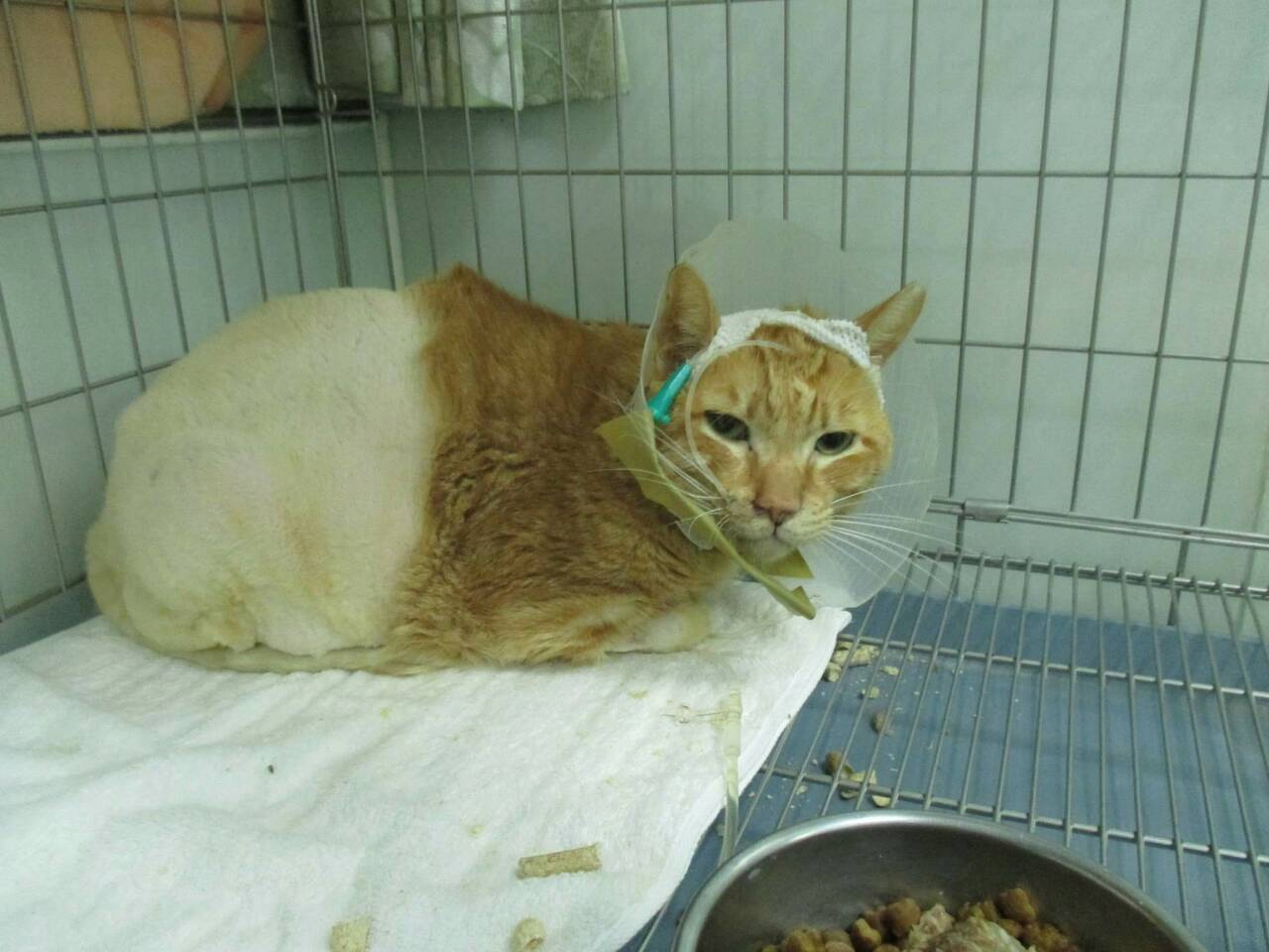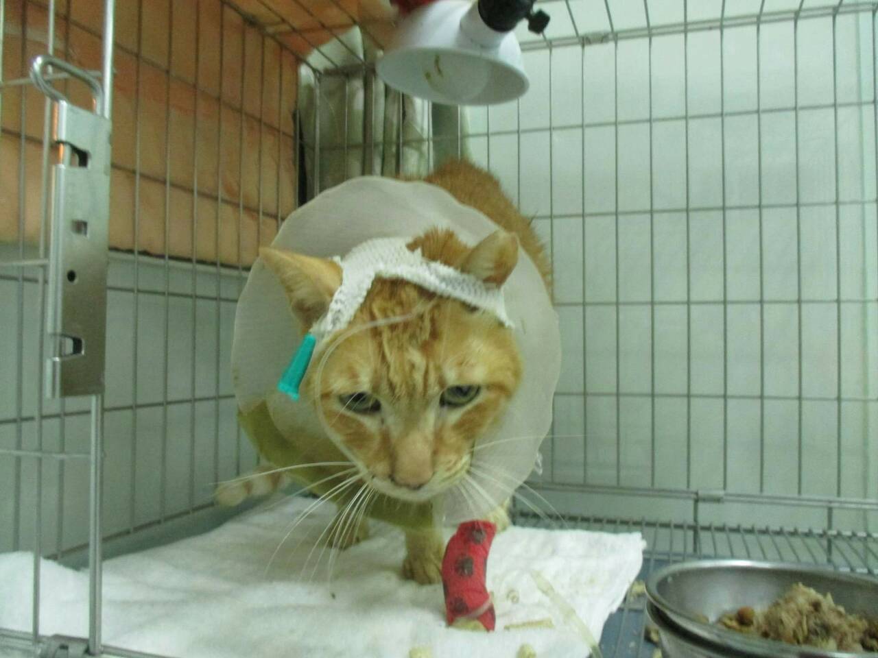 1/6 送醫後醫師初步診斷為下:因到院時後驅都是尿液,有漏尿現象呈現尿失禁狀態,尾巴無痛覺反應且不會擺動,可能薦椎神經有受損,腹部觸診會痛,有積糞,可能也無法排便,臀部剃毛後發現有外傷及瘀血跡象,初步驗血有白血球數及肝指數過高的現象,有發炎及肝損傷的問題,紅血球稍低,此外有牙結石及齒齦炎,貓二合ㄧ檢驗為貓愛滋陽性,貓咪可能有遭撞擊以致薦椎神經及肝臟受損...