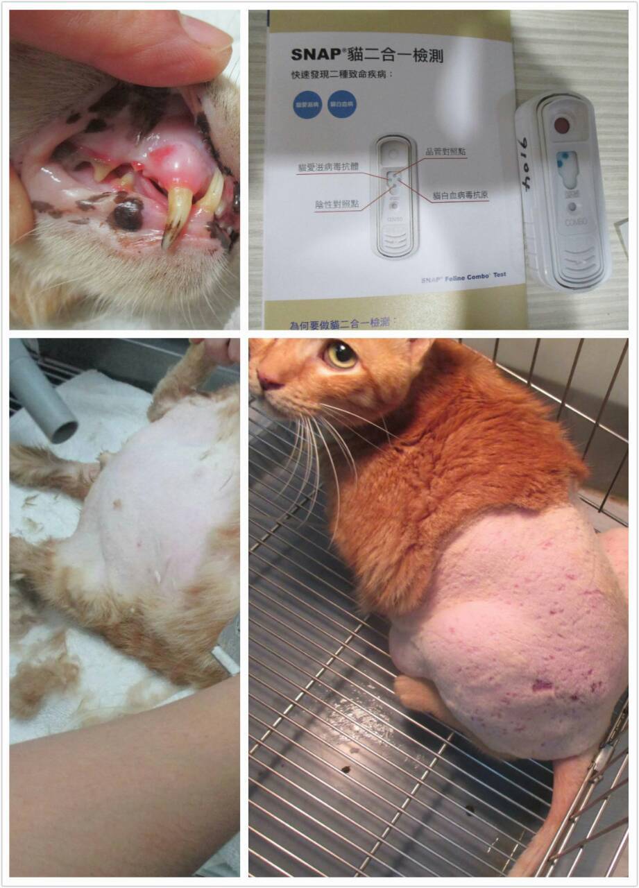 貓咪到院時後軀都是尿液, 醫生說有有漏尿的現象,尾巴無痛覺反應且不會擺動,可能薦椎神經有損傷,腹部觸診會痛, 有積糞可能也無法排便, 臀部剃毛發現有外傷瘀血跡象,初步驗血有白血球數及肝指數過高的現象,有發炎及肝損傷的問題,紅血球稍低, 此外有牙結石及齒齦炎,貓二合一檢驗為貓愛滋陽性,此貓可能有遭撞擊以致薦椎神經及肝臟損傷.