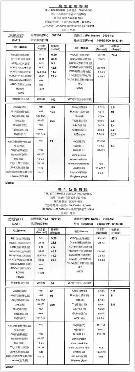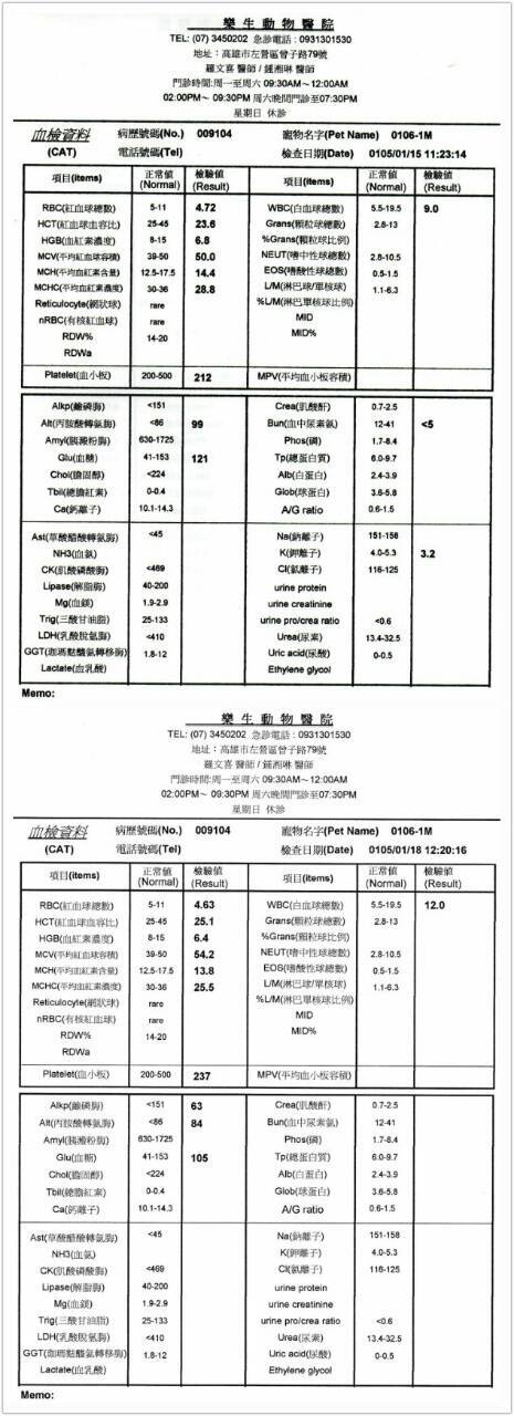 1/16 貓咪神經受損部分有明顯進步,會自己尿尿及排便了,肝指數也有下降,但白血球偏高有發炎的現象,精神有較好,但還是沒有自己進食,仍繼續灌食及藥物治療....