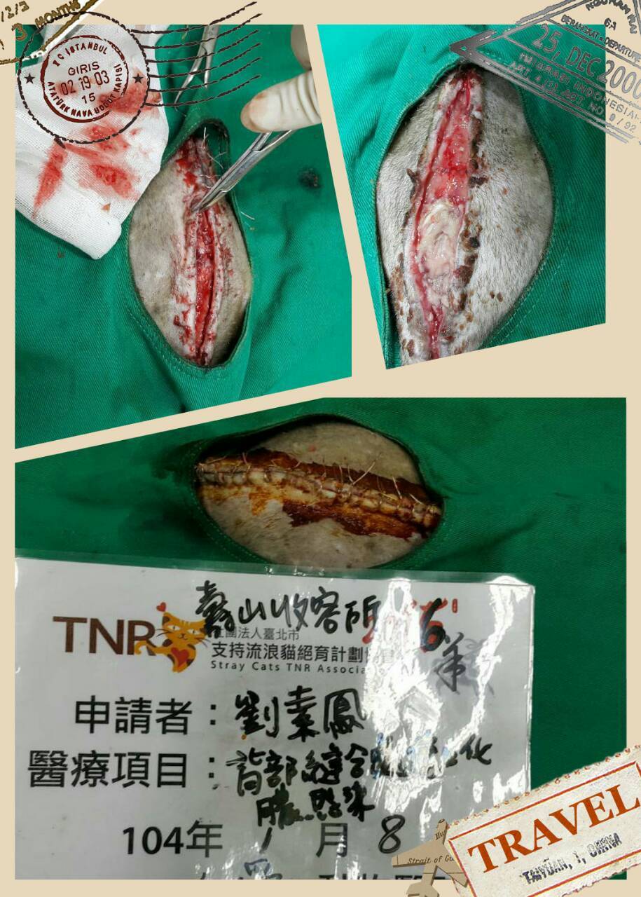 醫師特別強調一點:血液生化結果顯示:貓咪背部化膿縫合處傷口已造成脊椎脊髓炎~恐危及生命~醫院馬上全力的來救援這隻貓咪