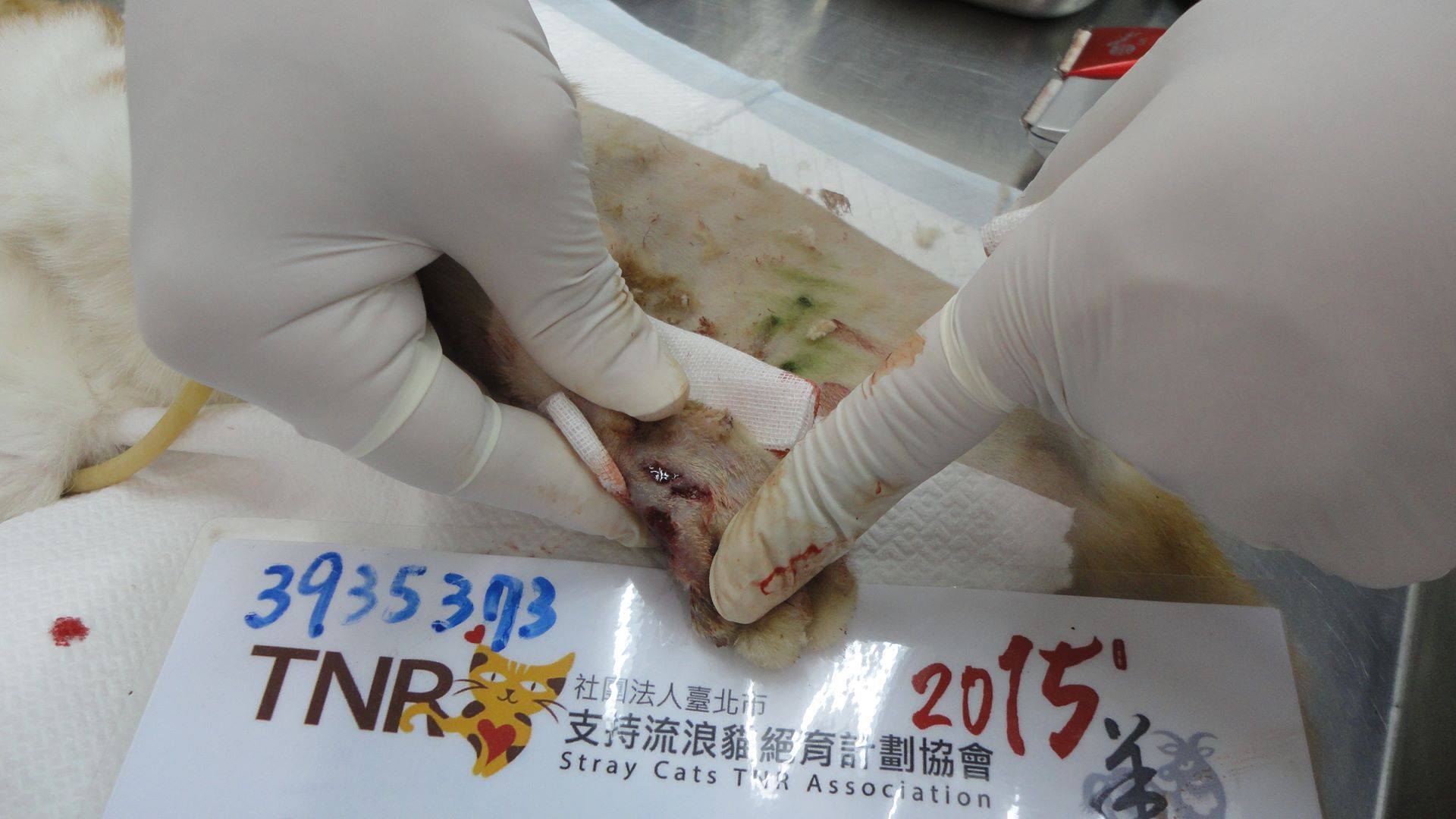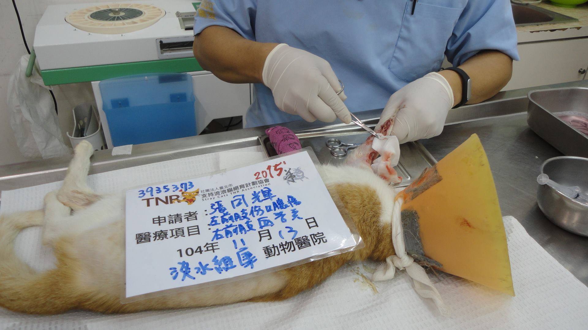 11/7院方處理貓咪的右前腳,小小的右手,潰爛嚴重,深可見骨…