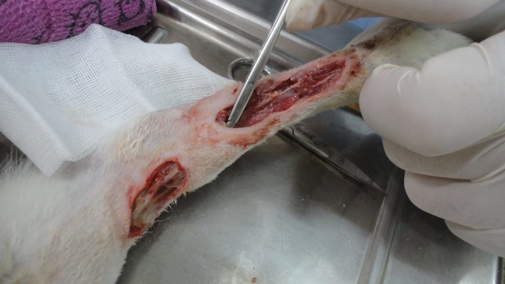 清創時,貓咪的左前腳嚴重化膿發臭,