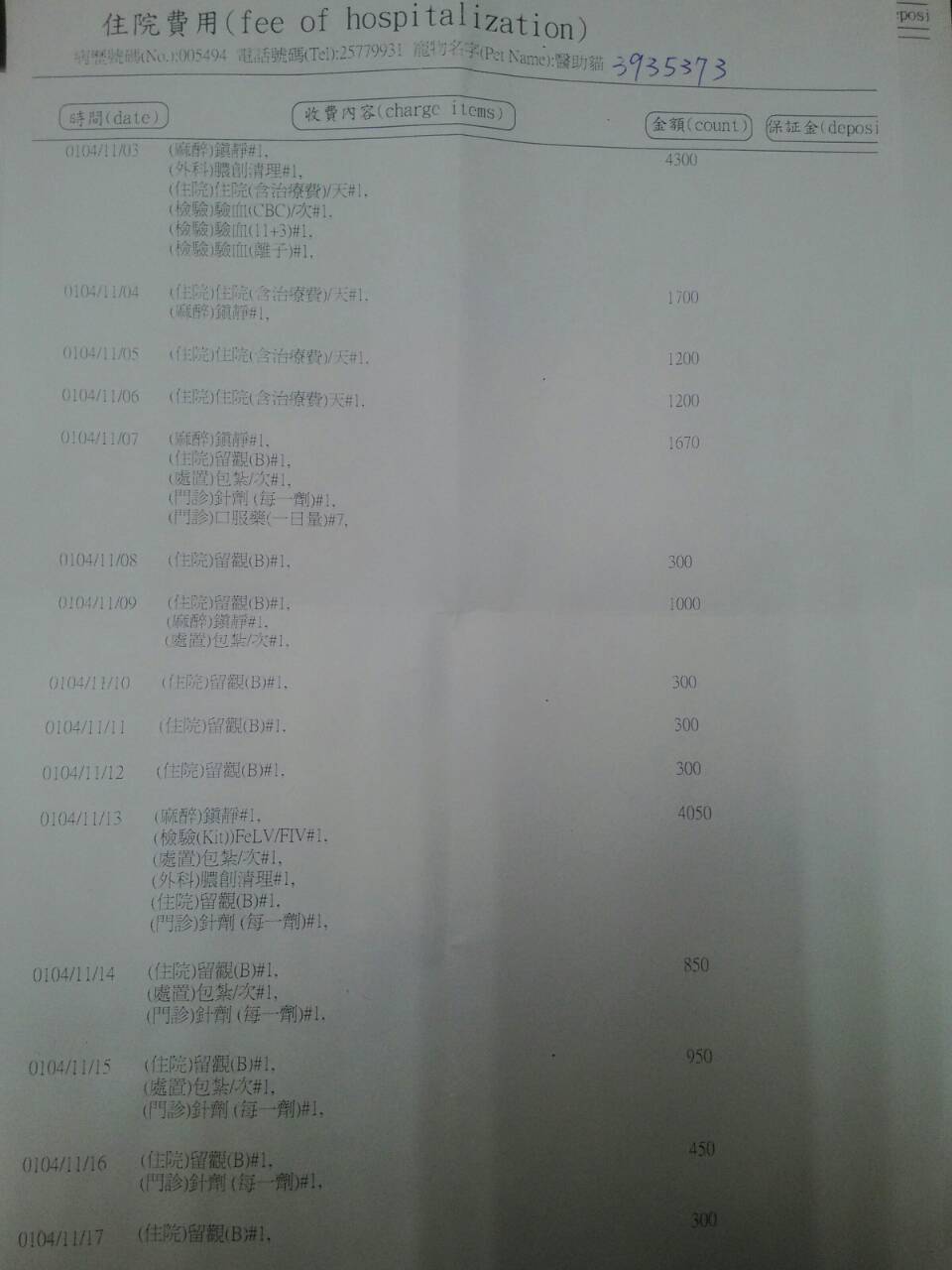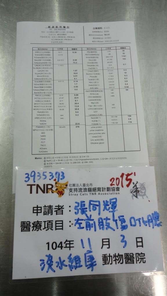 主題: 雙前腳分別嚴重化膿及發炎,幾乎失去生存能力的收容所愛滋貓 申請者姓名: 臺北市支持流浪貓絕育計劃協會 花色: 申請日期: 2016-01-12 19:06:00 申請者部落格: 申請者臉書網址: 所在縣市/合作醫院: 新北市/維康動物醫院 治療費用: 26712元 需求人數: 29人 已結案 (2024-06-01 13:41:58) 報名人員: Winnie Chen、Molly Wu(已付款)、mayuri(已付款)、ERic YU(已付款)、Chiaping Chang(已付款)、Ying-Ling Lai(已付款)、Mai Lin Lai x3(已付款)、Mai Lin Lai x20(已付款)、Vi Vi Hsieh(已付款)、 候補人員: 動物病情說明: 自新北五股收容所救出的小白橘,
