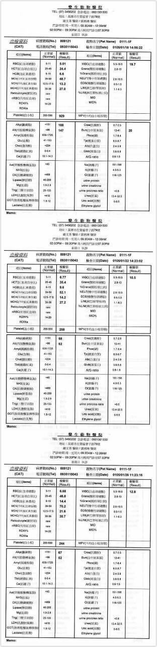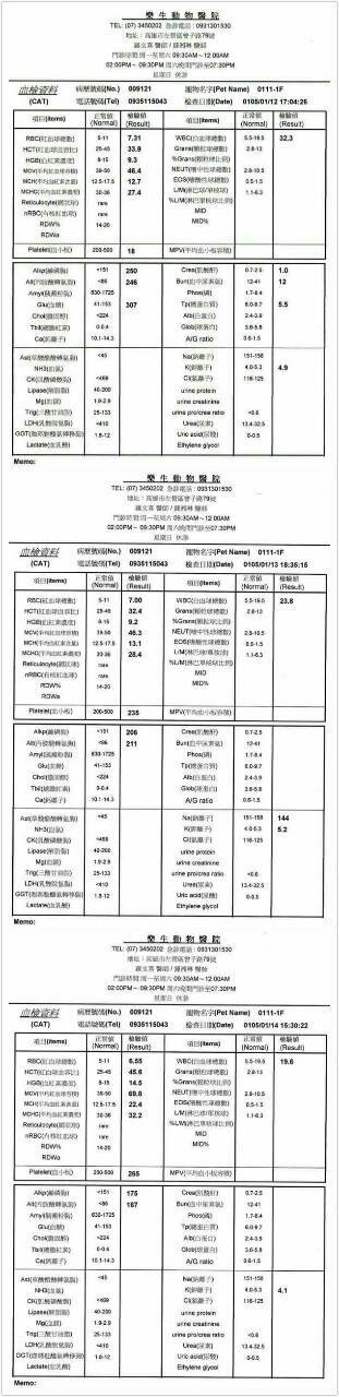 主題: 壽山收容所 貓瘟 頭顫抖的三花貓 申請者姓名: 劉素鳳 花色: 申請日期: 2016-02-26 00:29:09 申請者部落格: 申請者臉書網址: https://m.facebook.com/sufeng.liu?ref=bookmarks 所在縣市/合作醫院: 高雄市/樂生動物醫院 治療費用: 13300元 需求人數: 16人 已結案 (2024-06-01 13:41:55) 報名人員: 小喵劉 x2(已付款)、ERic YU(已付款)、gill(已付款)、吳小喵(已付款)、獅子王(已付款)、Mavis Tu(已付款)、Alice(已付款)、廖乙霖、Ivy Fu(已付款)、林碗茹(已付款)、Yuhui Chung(已付款)、BigMao、米哥姊姊 x2(已付款)、Emily Chen(已付款)、大智(已付款)、bai-yin(已付款)、 候補人員: 動物病情說明: 壽山收容所專案,此貓因為嚴重由其他醫院再次轉院而來,來的時候已經精神沉鬱,低頭後腳無力,低體溫,體重只有1.45kg,屁股有沾大便且有下痢,檢驗貓瘟呈現微陽性(試片出現淡淡的第二條線),初步驗血,肝指數偏高,嚴重低血鉀,白血球有核左轉(即白血球過度消耗,代表有嚴重發炎的問題),總蛋白過低,營養吸收不良,喝水時頭會不自主顫抖,可能有腦部的問題(小腦發育不全,腦炎,腦創傷..等),初步先點滴及給藥治療,視治療狀況再決定是否再做進一步檢查。 貓咪在院慢慢會抬起頭來,總算慢慢地復原了,腳也慢慢比較有力氣. 應該是腦受到撞擊造成的後遺症,修養之後等食慾恢復,我接回來照顧,目前貓咪狀況很好,原本擔心她不太活動,放風出來籠子外時跑得倒是挺快地,感謝大家幫助收容所貓咪獲得重生的機會^^