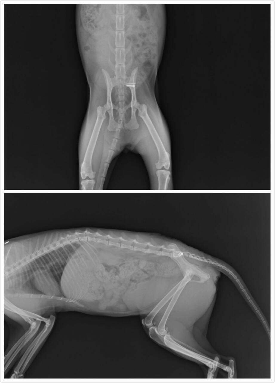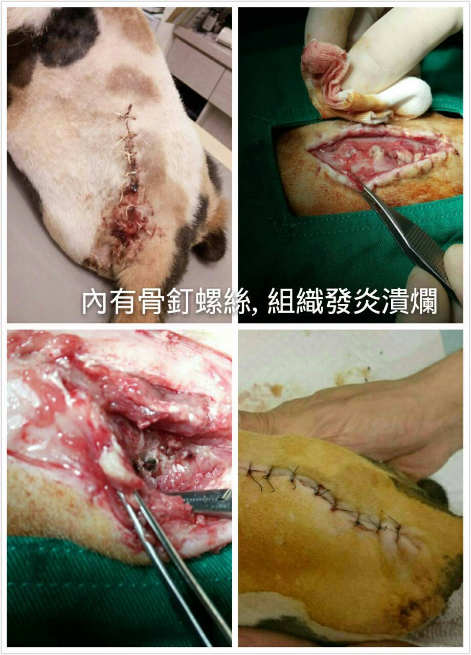 小刀後來傷口末端的縫線有點開,傷口有滲出液,越來越嚴重,醫生原本以為是他一直去磨籠子導致,所以就想說幫他清創一下傷口再縫合,結果傷口一打開不得了,裡面組織都發炎還有點潰爛,一直清下去竟然發現有骨釘跟螺絲…於是醫生盡量把一些爛肉跟不好的組織清掉,然後縫合,後來拍x光發現應該是左側腸薦關節有打骨釘跟螺絲,這讓醫生有點傻眼,因為來的時候原本壽山收容所給的資料只是外傷,所以看起來外面傷口好好的醫生就只給一些簡單的消炎藥,結果竟然是有動骨科,而且傷口現在又有問題,,後續的狀況目前無法評估,有可能傷口會持續潰爛,也有可能發炎控制住慢慢就會好,醫生先幫他上留置針,打靜脈抗生素,傷口包紮,靜待接下來的變化……