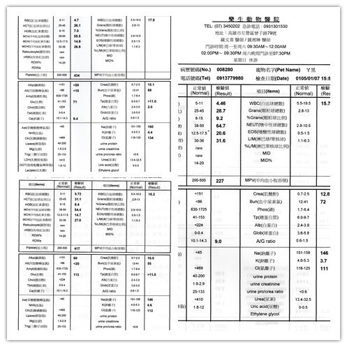 ㄚ黑到院時體溫37.1度偏低,觸診腹痛且嚴重脫水及口腔潰瘍,腎指數過高,耳翼皮膚及血清呈現黃疸,FPL檢驗為陽性,初步診斷為胰臟炎及腎病,此外血液抹片檢查白血球核左轉顯示有嚴重發炎