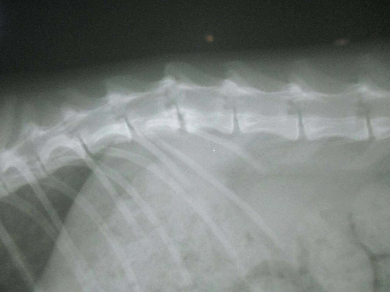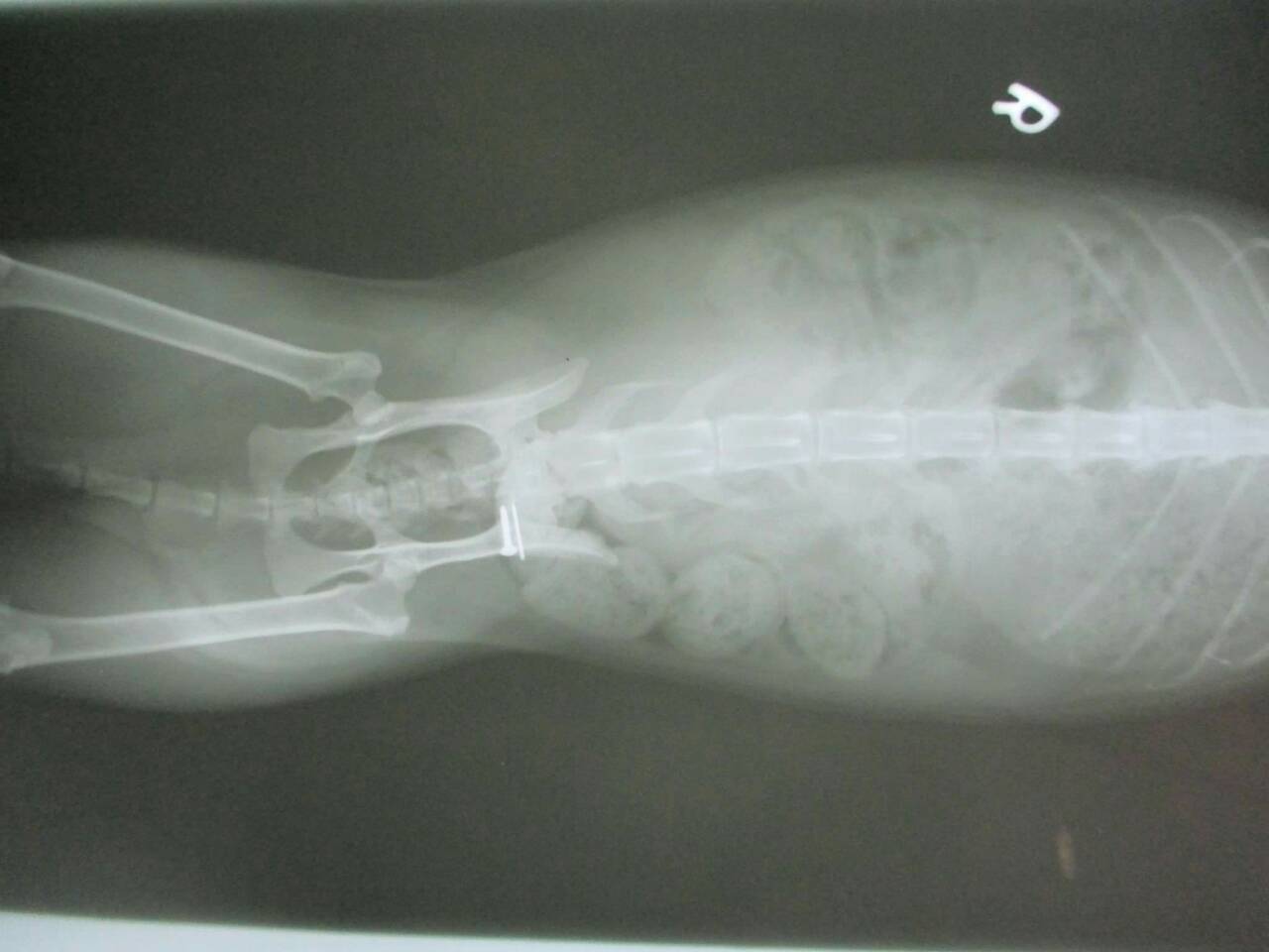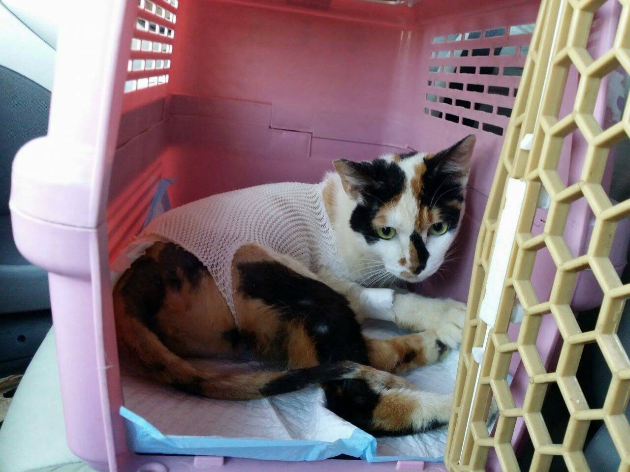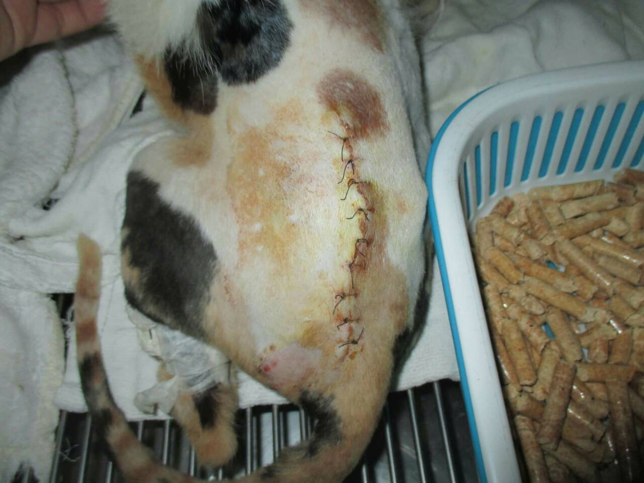 醫生初步檢查左邊腸薦關節有做手術,胸腰椎交接處(T13~L1)有受傷,可能是造成後驅癱瘓的主因,左右兩側後腳還有反射但左邊反應較差,傷口部分目前還好並無分泌物但後面幾天還是需觀察,如有分泌物出現則有可能又需做清創手術,血檢並未有異常,貓咪目前食慾還不錯,所以並未上點滴,目前會先就傷口照護為主, 醫生建議貓咪轉到大醫院做針灸的治療,努力應該會有康復的機會, 謝謝大家幫助這貓咪^^ . 、