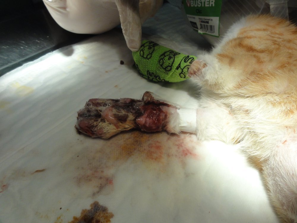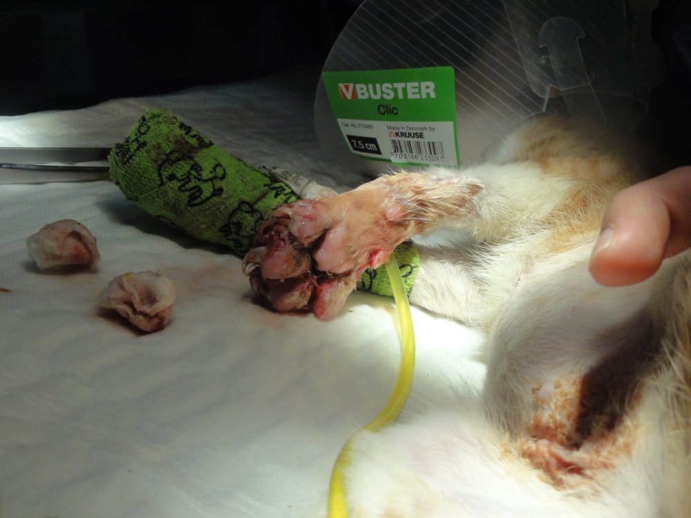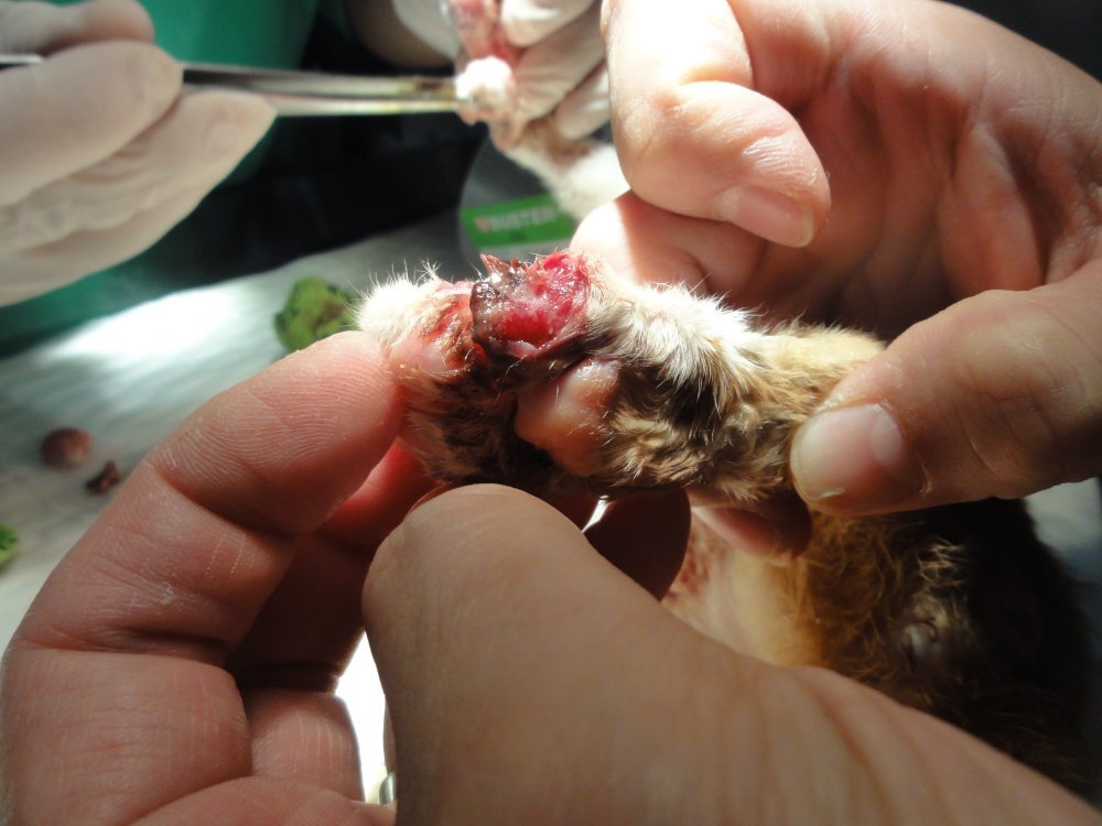 在治療的過程中,每個腳扯縫隙都會一直滲血出來,處理傷口過程會掙扎疼痛,且此貓非常兇悍,所以必須麻醉才有辨法治療。