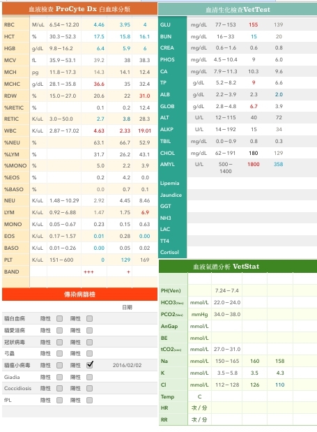 主題: 親人三花小浪貓好幾天沒有進食,以為是感冒抓去檢查結果是貓瘟 申請者姓名: 吳亭潁 花色: 申請日期: 2016-02-16 17:40:02 申請者部落格: 申請者臉書網址: 所在縣市/合作醫院: 高雄市/弘恩動物醫院 治療費用: 10700元 需求人數: 23人 已結案 (2024-06-01 13:40:56) 報名人員: 羅啟軒 x2(已付款)、比比 x2(已付款)、Iris Chiou x2(已付款)、吳毓軒 x2(已付款)、王小盈(已付款)、Sherry Ko(已付款)、米薇安(已付款)、吳孟潔(已付款)、郭兔兔 x2(已付款)、加歐斯 x2(已付款)、Ying(已付款)、kikiintw(已付款)、林大強 x2(已付款)、uihnd(已付款)、Moon x2(已付款)、 候補人員: 動物病情說明: 最近一位愛媽(阿華姊)因為癌症要做化療非常虛弱無法熬夜餵浪貓,於是託我幫忙餵養在九如四路與大榮街附近區域,有發現一隻才幾個月大的小貓都不吃東西好幾天,我覺得不太對勁進行誘捕,在2/3凌晨順利捕獲,當日送往弘恩動物醫院檢查,原本以為是感冒,結果檢驗出有貓瘟,因為癌症化療的愛媽知道了以後相當不捨,希望想請協會這邊協助募款幫助小貓獲得醫療,如果能夠順利痊癒,我願意幫忙中途找尋適當人家收養,因為小貓還滿親人的有很大的機會。 動物近況說明: 2/3 糞便檢驗出貓瘟 血檢異常部分為無再生性貧血脫水嚴重感染 腸黏膜有壞死或疑似胰炎