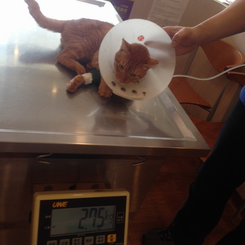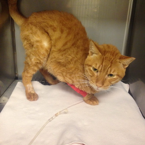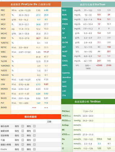 醫生先打了 dopamine CRI. 之後有改善。動物近況說明: 橘橘待在醫院時食慾依然沒有很好,雖然狀況有穩住,但橘橘的腎臟確定是不行了,接回家後每天要幫他打200CC的皮下點滴,飼料以處方籤飼料為主,在幫他額外加點雞肉泥,希望能讓牠胖一點