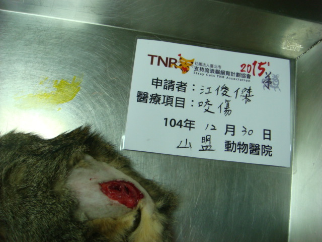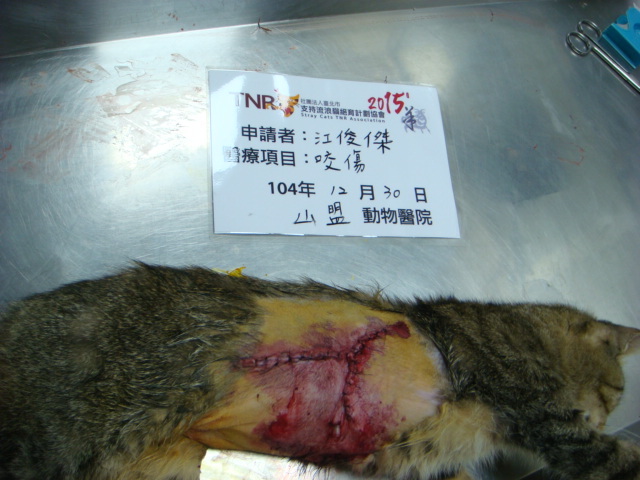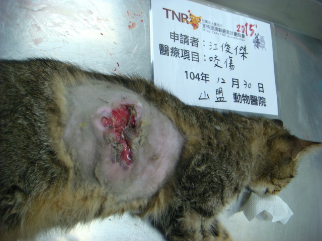 主題: 遭嚴重咬傷側腹部的浪貓 申請者姓名: 臺北市支持流浪貓絕育計劃協會 花色: 申請日期: 2016-02-06 13:20:50 申請者部落格: 申請者臉書網址: 所在縣市/合作醫院: 新北市/山盟動物醫院 治療費用: 11200元 需求人數: 13人 已結案 (2024-06-01 13:40:49) 報名人員: lavinia x3(已付款)、廖小茜(已付款)、Crystal(已付款)、平(已付款)、Kevin J Shih(已付款)、Sarah Xie(已付款)、KK(已付款)、洪家寶(已付款)、邱小燁、邱小燁(已付款)、薇薇安(已付款)、張瑞芬(已付款)、 候補人員: 動物病情說明: 1月20日