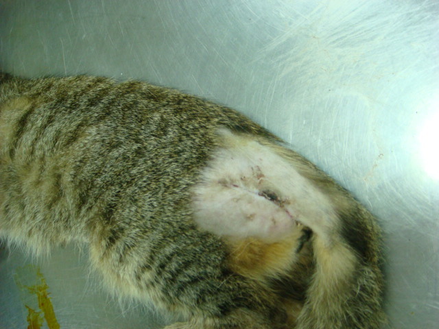 將毛剃除才明顯看出貓咪整個右側及背部