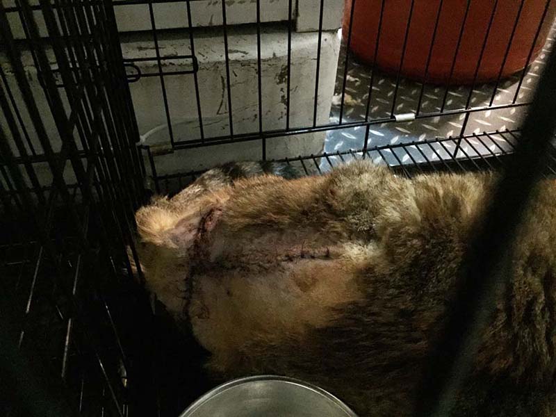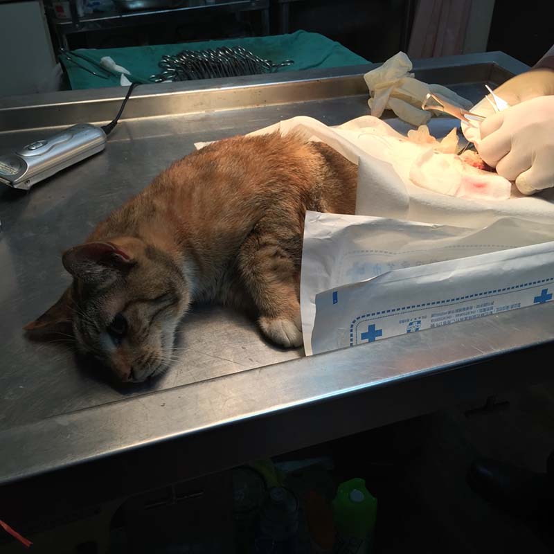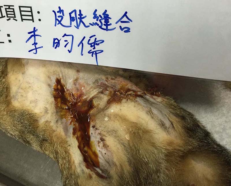 02/04先送往協會醫助合作醫院進行緊急縫合,醫生表示傷口過大,且已經拖延一段時間,部分有潰爛情形,也有長出肉芽,較不易癒合。