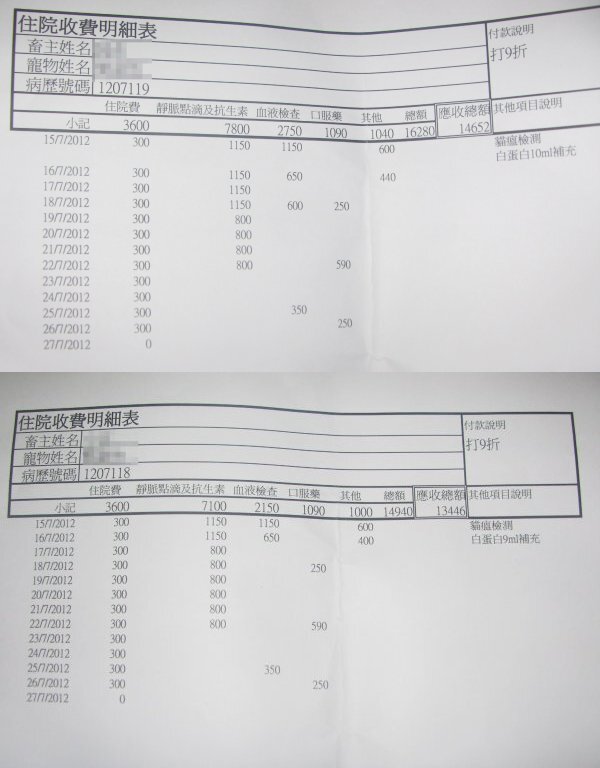 貓瘟的潛伏期是3至10天,在醫院治療的日子裡,醫師有通知可能會撐不過,因為當時二隻貓的狀況真的很差,一直在拉肚子,拉到脫水、血便、嘔吐,各項指數一度往下掉,所以每天靜脈注射打點滴加施打白蛋白,維持貓扺抗病毒的體力。