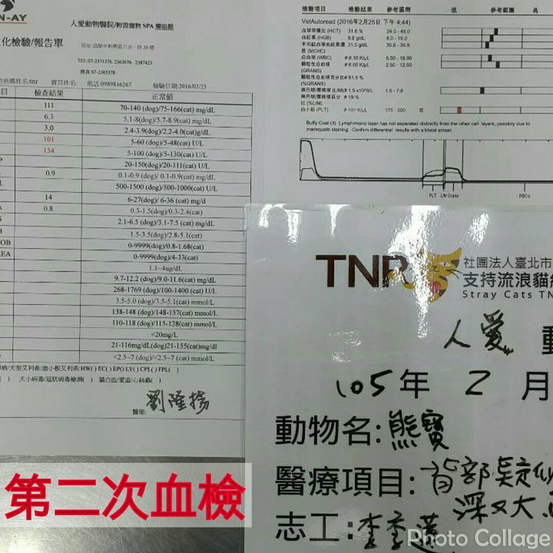 2/25熊寶住院第八天,點滴注射治療第五天,拔除點滴先做第二次血檢,報告顯示白血球肝指數血糖值已下降血小板上升,肝指數雖偏高但食慾精神狀態好,傷口二端縫線拆除,中間較深傷口多留幾天再拆, 因熊寶年輕無愛滋肝指數可能會隨日後原放餵養區壓力消除慢慢恢復考量後進行節育手術!