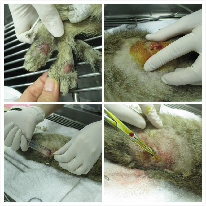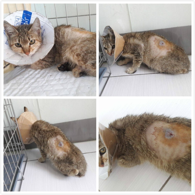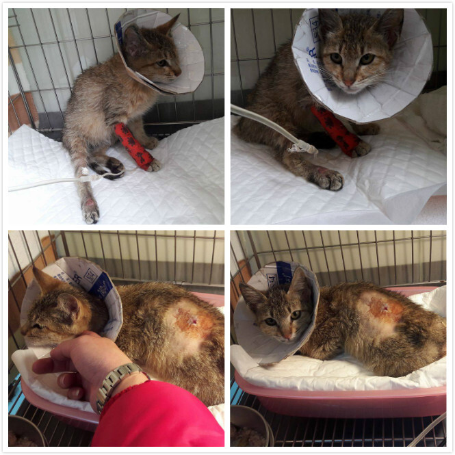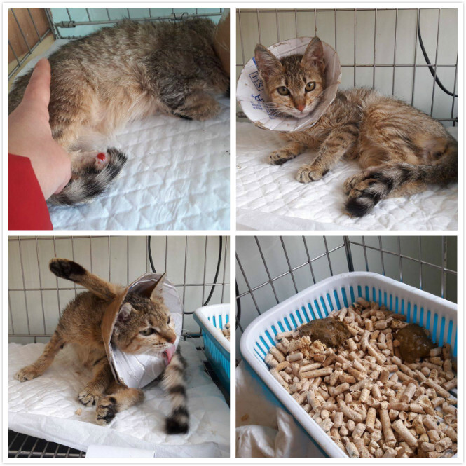 詢問了一下醫生小貓咪的狀況~小貓咪身上的傷口比較不像被狗咬的~畢竟只有一個傷口~也不像被撞的~如果是被撞~畢竟是小貓~一定更嚴重~醫生猜測比較像是自己去撞到尖銳的東西而造成的傷口~而有去傷到神經造成癱瘓~目前有照X光~目前沒斷裂的狀況~傷口應該至少3~4天了~有化膿現像~所以先投抗生素治療~傷口好多了在來看神經方面是否有修復希望~因為送醫那天有看到小貓有自己稍微用後腳支撐一下~