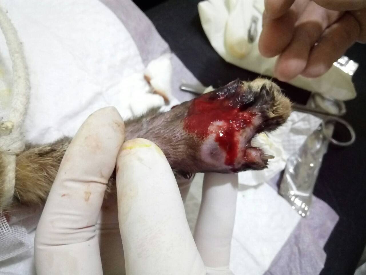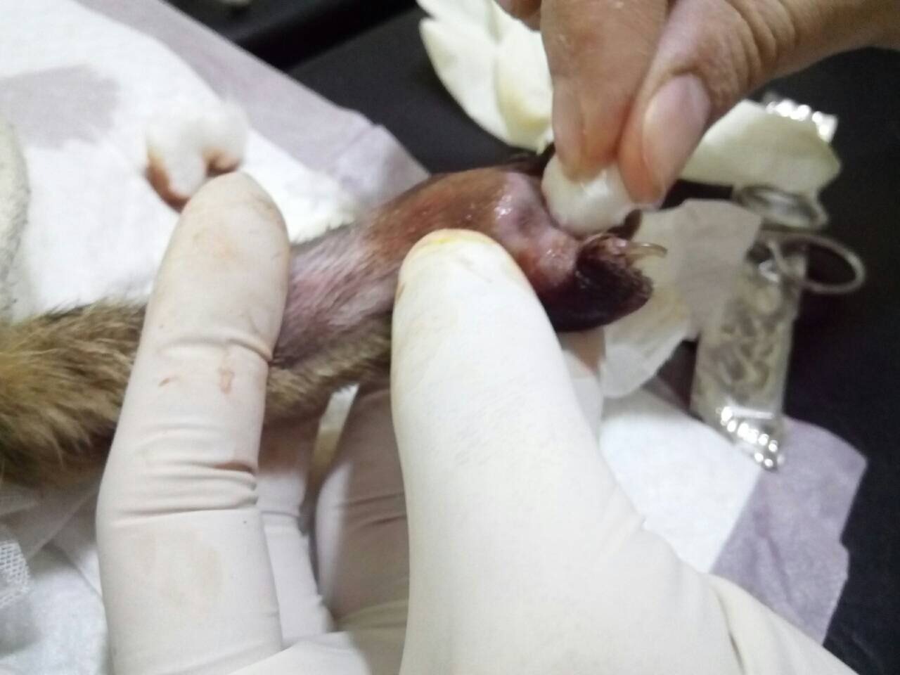主題: 跛腳大貓 申請者姓名: 張菱予 花色: 申請日期: 2016-03-18 09:56:59 申請者部落格: 申請者臉書網址: https://www.facebook.com/clyanal/posts/1056022744418416?notif_t=like 所在縣市/合作醫院: 高雄市/小新動物醫院 治療費用: 5300元 需求人數: 11人 已結案 (2024-06-01 13:39:16) 報名人員: 艾妮、艾妮 x2(已付款)、Yian Chen(已付款)、王琇盈(已付款)、Evania(已付款)、薇薇安(已付款)、Wang Yungting(已付款)、Eric Chien(已付款)、Leo Li(已付款)、趴趴(已付款)、鄭之緹(已付款)、 候補人員: 動物病情說明: 校園附近街貓因受傷跑進校園中嚎叫,餵食時發現左後腳腫脹跛行,需照X光看骨頭是否碎裂,擔心傷口嚴重感染發炎,誘捕後送醫治療。 動物近況說明: 因傷口禿毛發炎腫脹,先做血檢排除貓愛滋白血的可能,照X光觀察骨頭是否受損。判斷後為傷口內有膿血需做清創,經醫生評估麻醉清創後做節育手術不影響傷口復原,清創後給予針劑治療住院觀察五天後恢復良好,原放後已可正常行動。