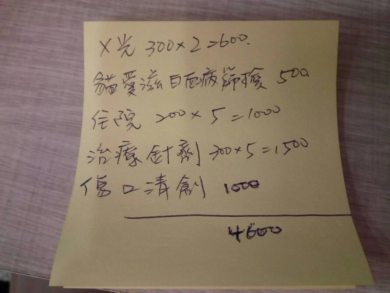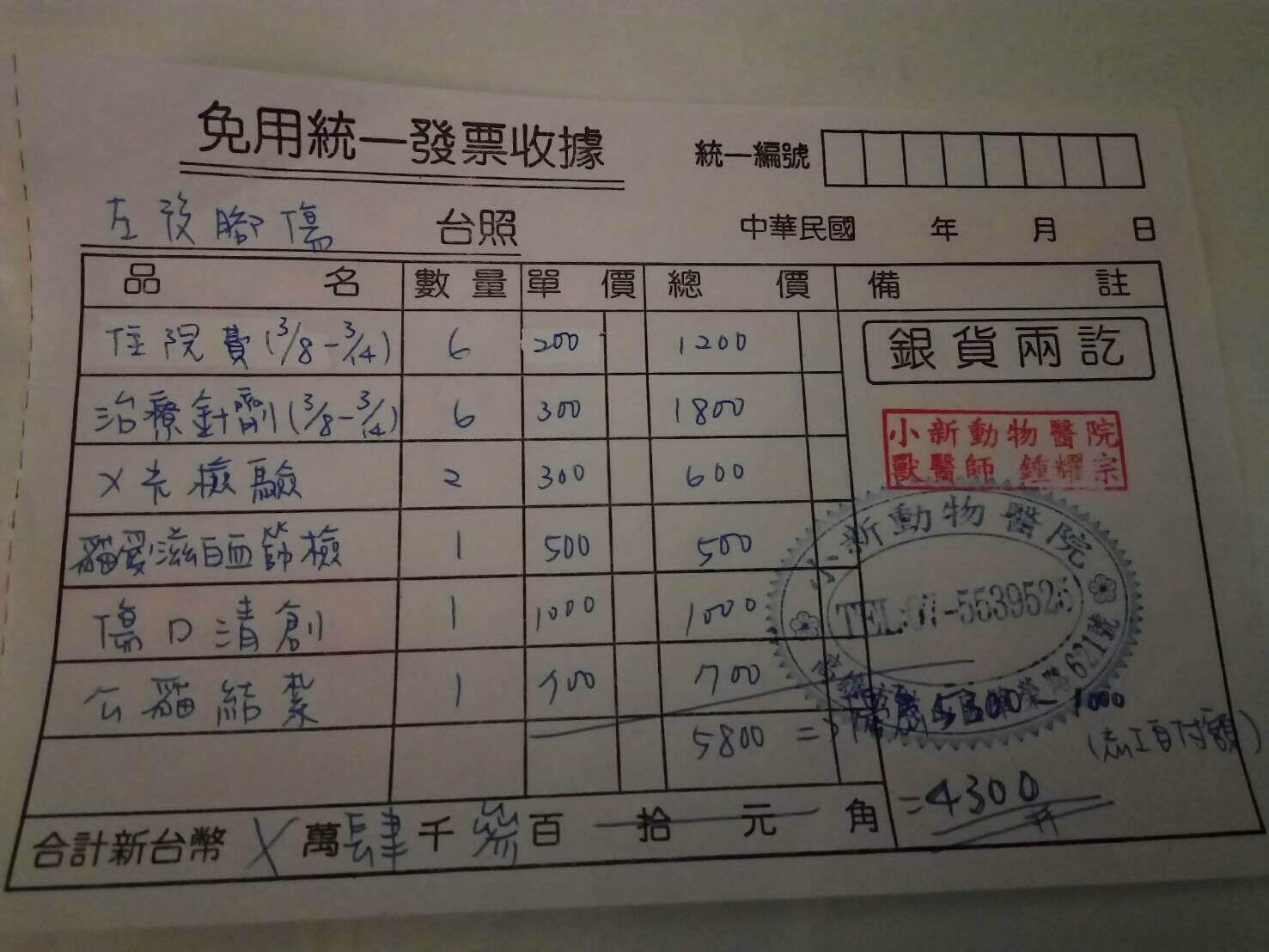 (抱歉,原本估價總金額為4600元,不小心計算錯誤,因醫生加做節育手術,最後總金額為5300元)