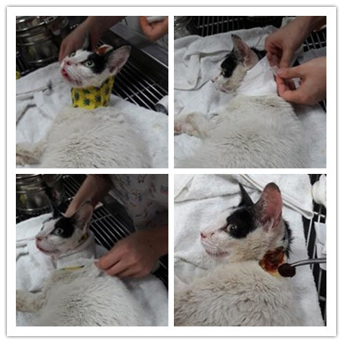 今天過去剛好碰到大約2~3天就要清潔ㄚ嗚的餵食器的傷口~所以順便看了一下醫生們怎麼幫ㄚ嗚做清潔~因為ㄚ嗚比較兇~所以還是需要打點微量的麻藥~打麻藥前還必須先用毛巾先蓋住頭部~才有辦法~