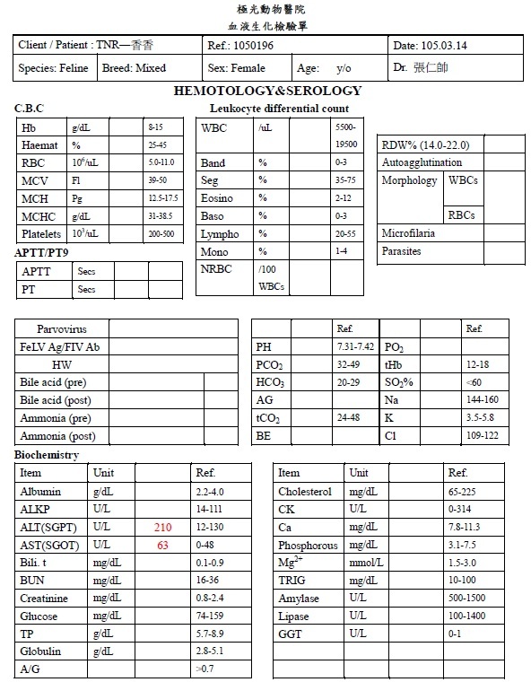 主題: 急性肝炎嚴重嘔吐的香香 申請者姓名: 臺北市支持流浪貓絕育計劃協會 花色: 申請日期: 2016-03-19 17:50:48 申請者部落格: 申請者臉書網址: 所在縣市/合作醫院: 台北市/其他院所醫助專案(醫院請先MAIL溝通) 治療費用: 4491元 需求人數: 11人 已結案 (2024-06-01 13:39:02) 報名人員: fruitshop_cats(已付款)、Kai-Ju Chang(已付款)、莉蘿(已付款)、李強強(已付款)、李強強(已付款)、帕帕(已付款)、點子、Ivan x2、Ivan x2(已付款)、薇薇安(已付款)、比比、Tora Li(已付款)、陳佐妹(已付款)、 候補人員: 動物病情說明: 香香從前是民眾通報協會,