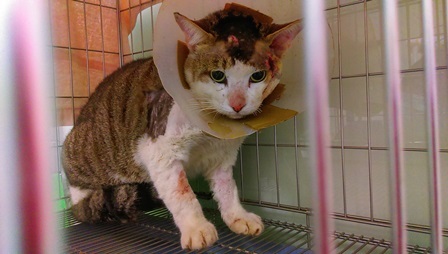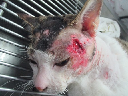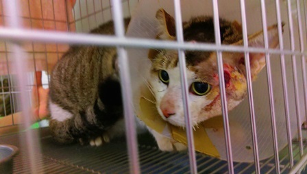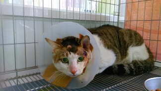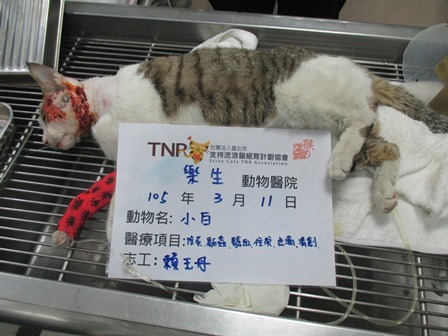 主題: 臉部貴爛小白 申請者姓名: 賴玉丹 花色: 申請日期: 2016-03-22 10:57:34 申請者部落格: 申請者臉書網址: 所在縣市/合作醫院: 高雄市/樂生動物醫院 治療費用: 6195元 需求人數: 14人 已結案 (2024-06-01 13:38:55) 報名人員: Ava Yi、Ava Yi、Ava Yi、Carrie(已付款)、Mickey Han(已付款)、Hsia Ruei(已付款)、曾凱洛 x2(已付款)、橘子貓(已付款)、Love Tsai、Mavis Tu x2(已付款)、Emily Yen x2(已付款)、Eric Chien(已付款)、廖乙霖、Usagi(已付款)、Puffy(已付款)、midori(已付款)、 候補人員: 動物病情說明: 3/8(二)晚上餵食時,發現小白左臉明顯腫脹,是餵食區內的貓咪,只是他是後來才搭伙的,所以跟我並不親近,當天晚上即到臉書貓咪群組上po文,尋求幫忙誘捕,於隔天3/9(三)有位小姐願意幫忙誘捕,但當天晚上餵食時小白並無出現。於隔天3/10(四)中午小白有出現,但躲在遠處,所以並無法看清楚傷口,與幫忙餵補的小姐約好3/10(四)晚上進行誘捕,但由於下雨,所以就沒進行誘捕。另約3/11(五)中午進行誘捕,剛好小白也又出現,小姐用吹箭麻醉的方式進行誘捕,但低估小白的體重,所以小白並無完全麻醉,後來逃到水溝中,本以為麻醉藥已起作用,故翻開水溝蓋躦進去抓貓,但小白卻逃得更遠,逃到有水的地方,躺在那邊,以致全身溼透,後來又補了一針,才有昏睡的感覺,緊急送醫後,應該是當身體虛弱加上全身濕透,有失溫,臉部幾乎潰爛長膿,臉部表皮僵硬。 動物近況說明: 於送醫當天晚上有過去探視,但由於麻醉尚未全退,所以小白沒什麼反應,也尚未進食。於隔天醫生表示有開始進食,食慾還好,星期一再次探視,有跟醫師詢問,礙於經費不足,是否能帶回自行照顧,醫師表示可以,但須2~3天回診一次,後來約星期二出院,但當天醫生及回電告知食慾不佳,等下午在清瘡後再看看是否可接回照顧,後來告知,傷口有變小,但由於食慾不佳,先等穩定後再帶回照顧至傷口復原,在考慮原地放回,由於小白也尚未結紮,等傷口好了,會再進行結紮在野放回去