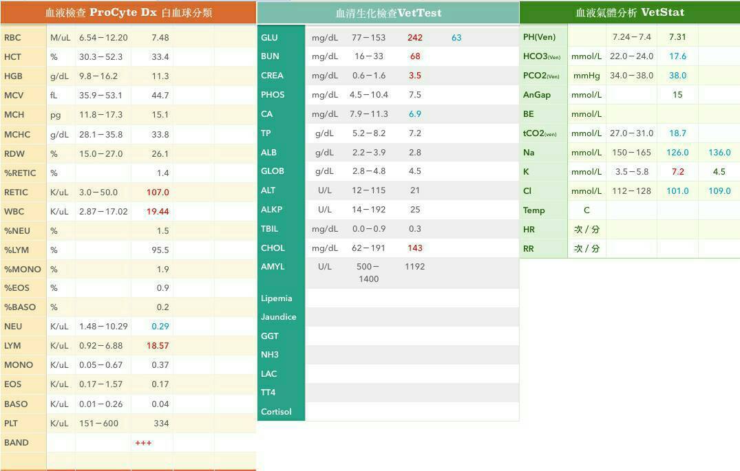 血鉀過高治療方式:1.先打葡萄糖鈣點滴降血鉀,並補充低血鈣的問題。2.打降血鉀藥物 Actrapid 短效型 insulin CRI. 搭配fructose 點滴。校正高血鉀造成的心率不整的問題。血檢結果 1.年輕白血球高 嗜中性球超低 淋巴球高 有嚴重敗血症。2.高血糖及腎衰竭 3.低血鈣。4.高血鉀 低血鈉及低氯血症。5.代謝性酸中毒。搭配多種點滴,依血液監控來做精確的調整,包括 血糖せ血鈣せ鈉せ鉀せ氯せ酸鹼平衡等等。
