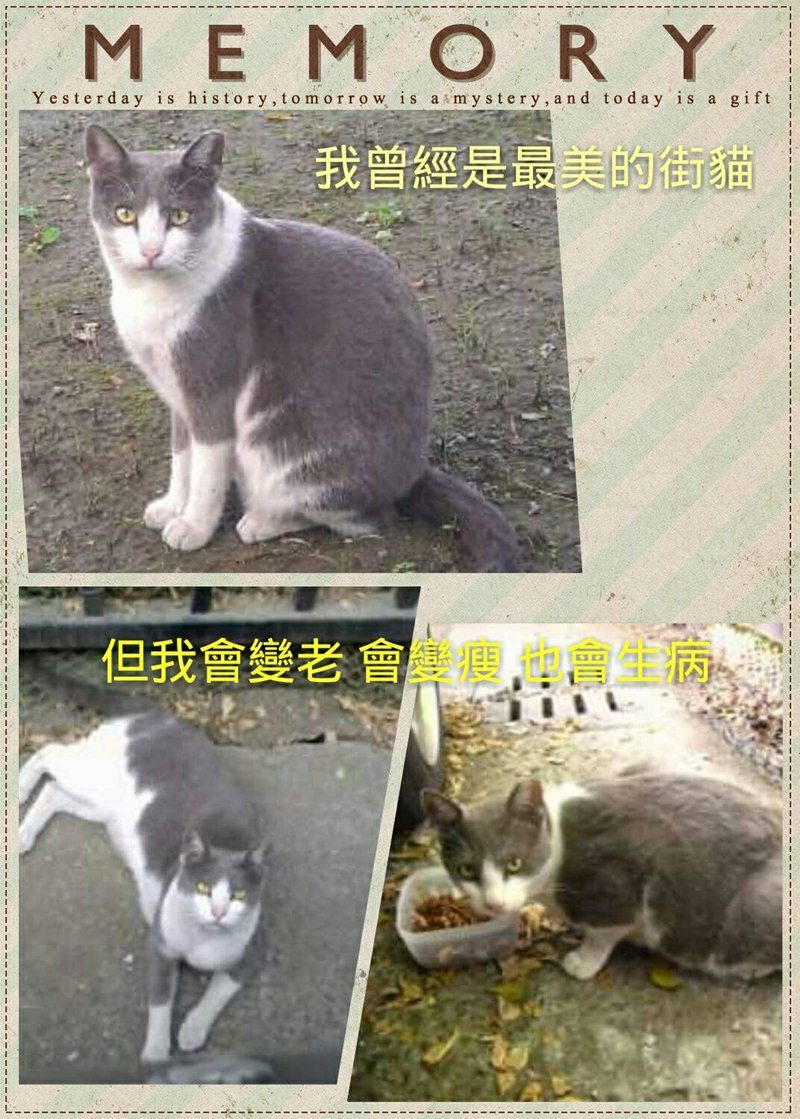 主題: 小港 脫肛的灰白賓士貓 申請者姓名: 劉雅雲 花色: 申請日期: 2016-04-21 07:34:56 申請者部落格: 申請者臉書網址: https://www.facebook.com/sisly.liu 所在縣市/合作醫院: 高雄市/弘恩動物醫院 治療費用: 27000元 需求人數: 29人 已結案 (2024-06-01 13:38:29) 報名人員: 林瑞心 x3(已付款)、Melody Tsai(已付款)、Sarah Xie(已付款)、karyn(已付款)、Huang Edie、Jasmine Lin(已付款)、賈東東、IAMROGER(已付款)、catannchen x2(已付款)、陳雯淑(已付款)、張承歡(已付款)、Eric Chien(已付款)、tpesandra x3(已付款)、Polly Ma(已付款)、Min(已付款)、Peter(已付款)、SweetTpg(已付款)、Patrick x7(已付款)、小可(已付款)、明益聯合實業有限公司(已付款)、 候補人員: 動物病情說明: 這是5-6年前在工作地點旁開始餵食的街貓,他非常的美但之前不太親人所以一直沒有能幫他找個家,但他住在這邊還算悠哉,隨著他年紀越來越大,他漸漸消瘦,感覺不像之前那樣的豐腴和健康,最令人擔心的事果然發生了,他好幾天沒看到,沒出來吃,還好我特地繞了一下,發現他不太願意動待在一台汽車下,偉嘉罐頭果真好用,雖然他沒食慾但還是被罐頭引了出來。