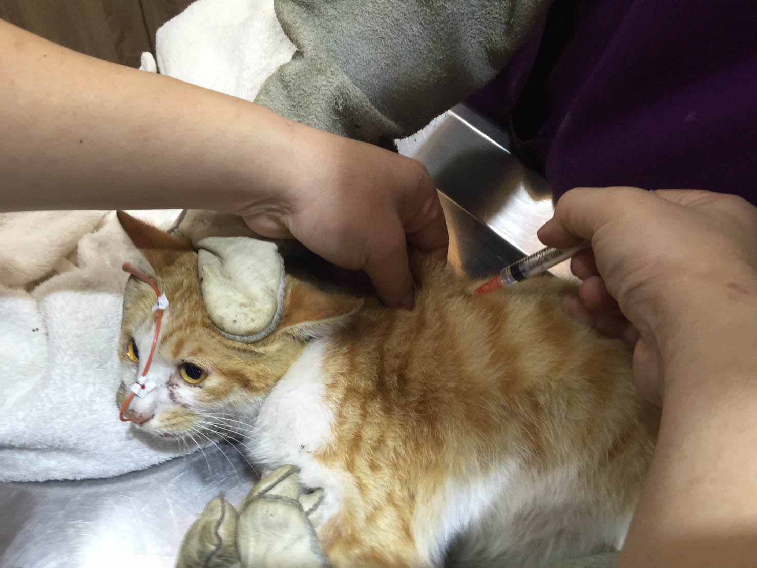 因為橘橘貓咪不進食,所以醫師每日注射藥劑治療因車禍而受傷的消炎止痛的針劑,依舊是每日灌食。