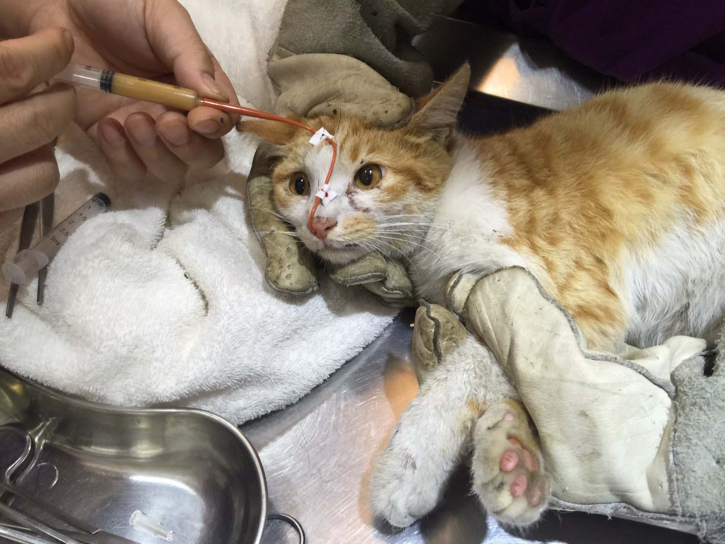 到院時,醫生先觀察貓咪的狀況,貓咪剛開始的活動力很差,幾乎都不活動,還是先注射消炎止痛的針劑;貓咪也不主動進食,所以醫生為貓咪裝置鼻胃管,每日灌食以維持生命。