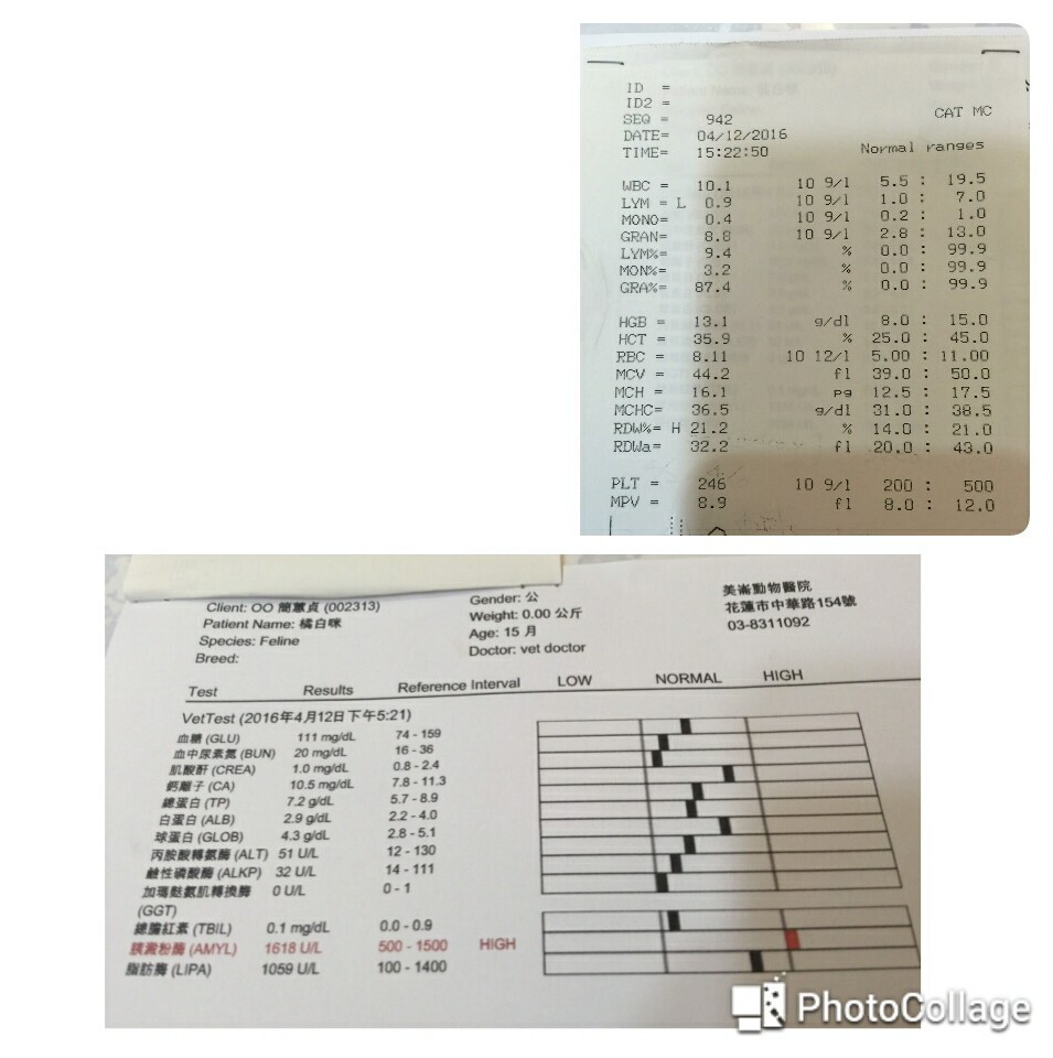 隔日為貓咪進行血檢,報告的指數都正常,而內出血的狀況雖也漸漸穩定了,但貓咪的活動力依舊很差,仍不進食。