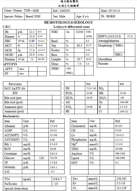 主題: 嚴重肺炎的帥帥 申請者姓名: 臺北市支持流浪貓絕育計劃協會 花色: 申請日期: 2016-04-18 22:19:25 申請者部落格: 申請者臉書網址: 所在縣市/合作醫院: 台北市/其他院所醫助專案(醫院請先MAIL溝通) 治療費用: 17847元 需求人數: 38人 已結案 (2024-06-01 13:38:09) 報名人員: Jack Wei x6(已付款)、Mindy Kan x5(已付款)、Pororo Mei(已付款)、迪迪(已付款)、米薇安(已付款)、耿志丞(已付款)、Doc Tian(已付款)、野薑花(已付款)、野薑花(已付款)、Ann Yang x2(已付款)、cathy(已付款)、兔子(已付款)、張承歡(已付款)、Wt Chien(已付款)、Yuyu lin x2(已付款)、Vetan kau(已付款)、張禾空間設計工作室(已付款)、yintung(已付款)、郭兔兔 x2(已付款)、Blythe Chen x7(已付款)、 候補人員: 動物病情說明: 帥帥店長是協會之寶,