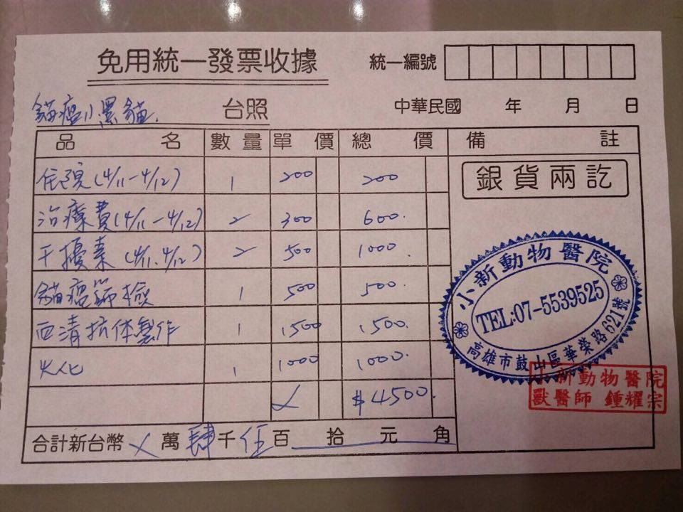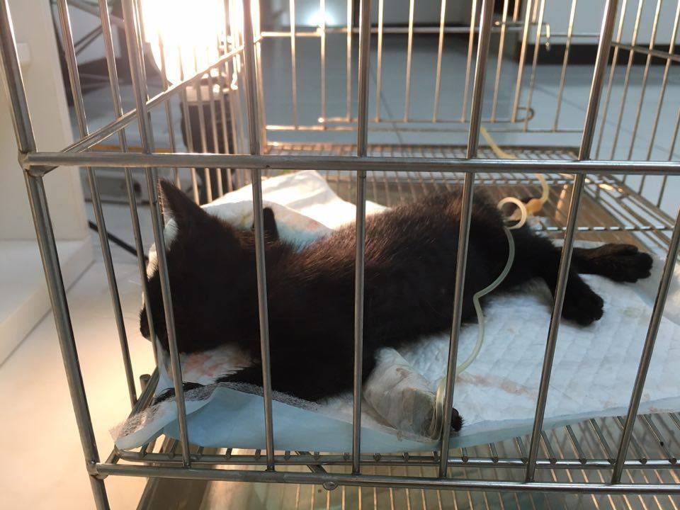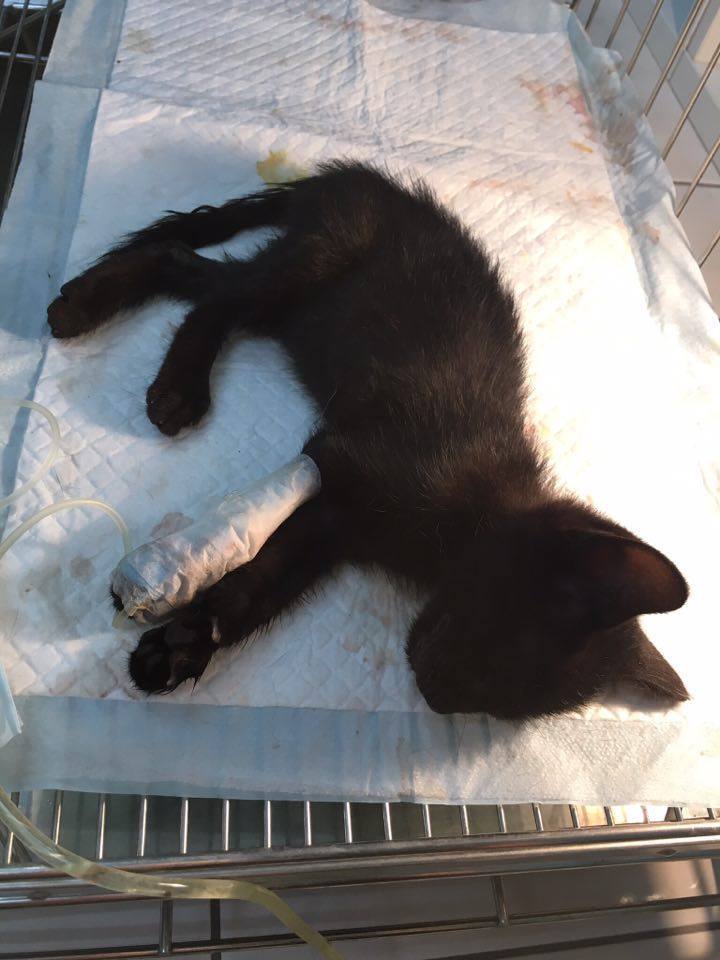 4/14小黑弟開始住院後身體越來越虛弱,不斷地抽蓄咳嗽嘔吐,雖然打點滴用營養針和干擾素想讓牠恢復體力,但病情卻急轉直下,隔天找到貓瘟血清,但注射完血清後仍然非常虛弱,最後還是上天堂去當小天使了。