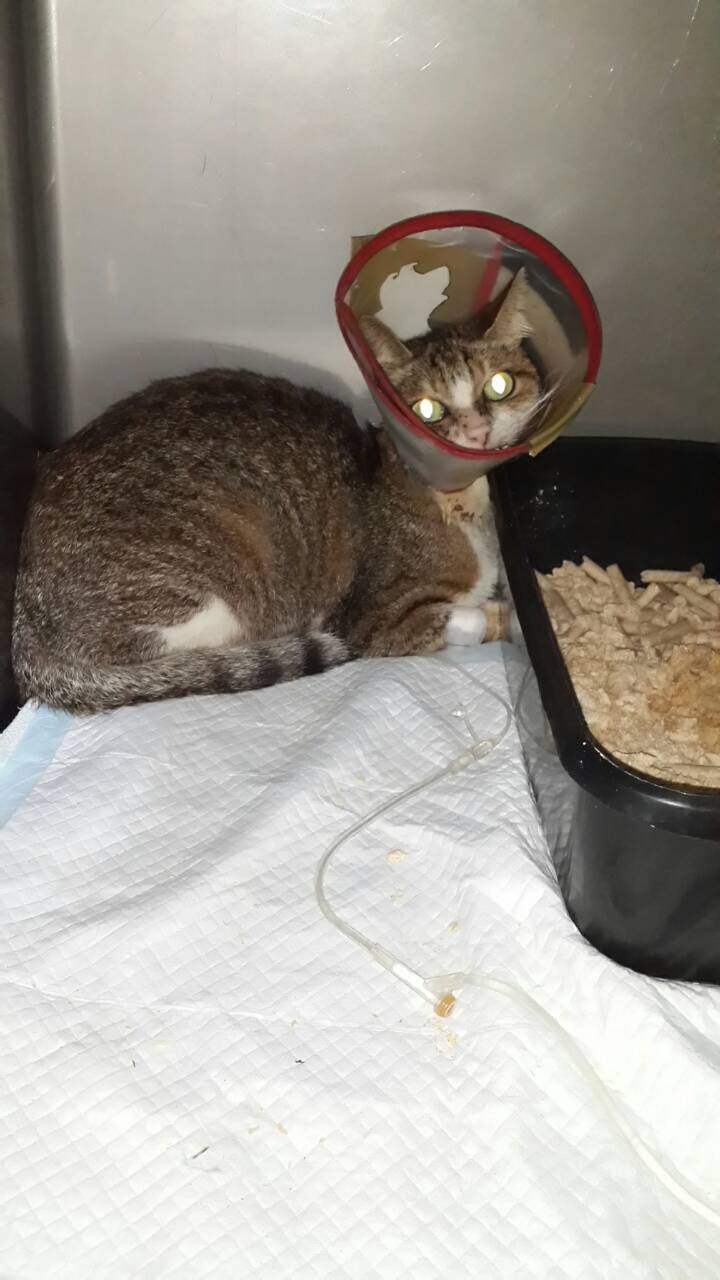 接下來幾天依然緊張,繼續躲在角落,但由於食慾有好轉,藥拌罐頭會吃光,尿尿大便也正常,體重還是偏瘦,需要再努力餵養,以利後續療程及結紮