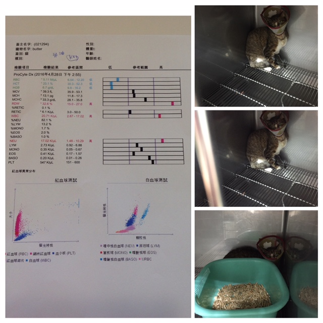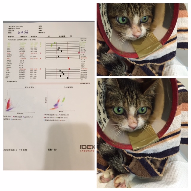 臉有變較乾淨,呼吸異音變小,也較無鼻膿與眼睛分泌物;尿液培養發現有細菌需持續吃藥控制;血液檢查發現貧血有降低至20.7,比較讓人擔心,幸好食慾有穩定,希望她藉由充分的營養來改善貧血症狀。白血球仍高,較第2次驗血減少許多,是好現象